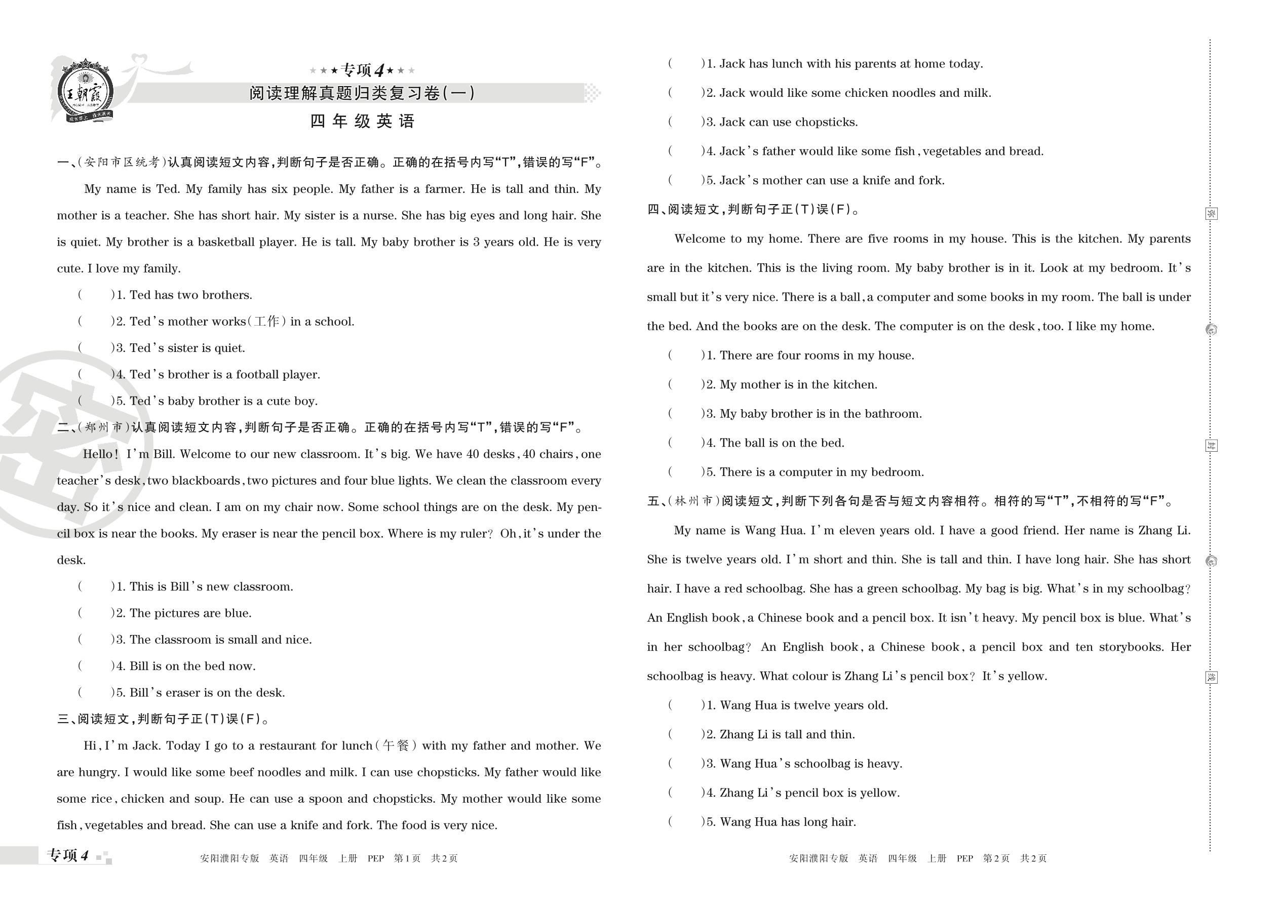 王朝霞期末专项卷——阅读理解真题归类复习卷(一)四年级上册英语(人教PEP版)【4】