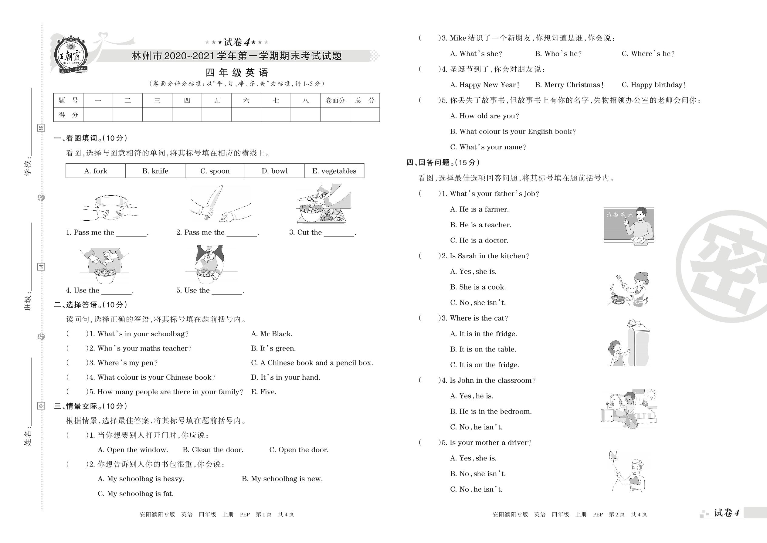 林州市2020~2021学年第一学期期末考试试题四年级英语(人教PEP版)【4】
