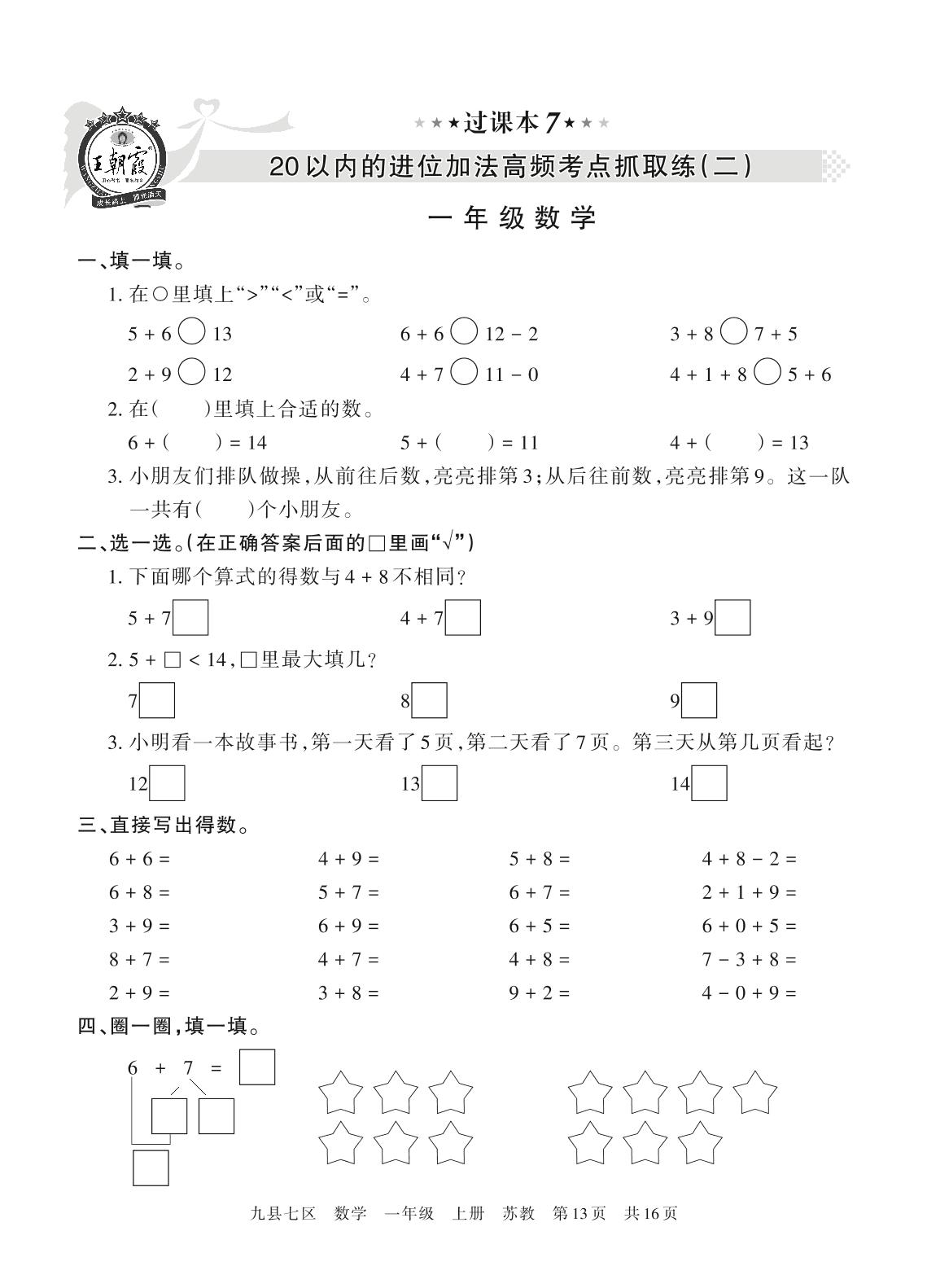 王朝霞期末过课本——20以内的进位加法高频考点抓取练(二)一年级上册数学(苏教版)【7】