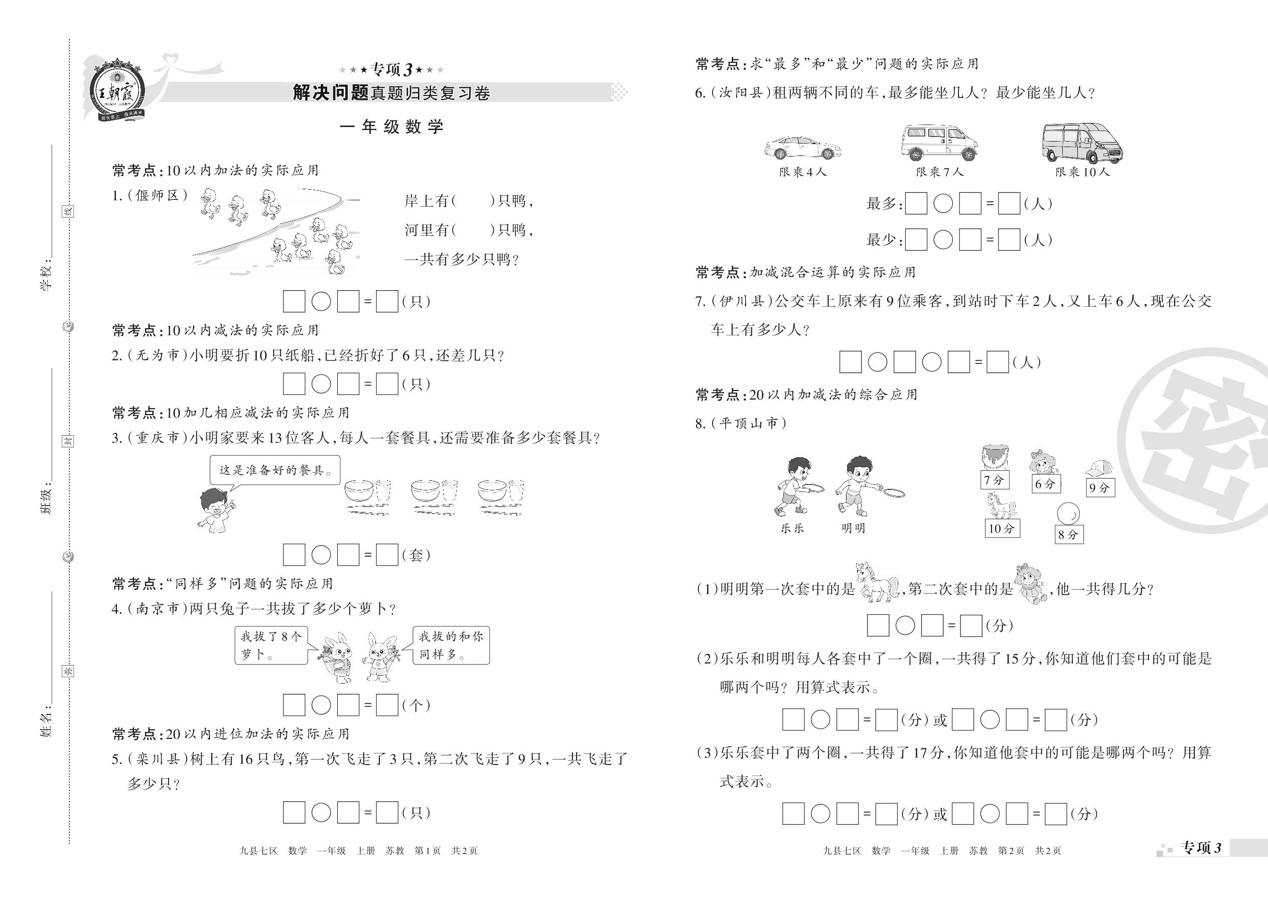 王朝霞期末专项卷——解决问题真题归类复习卷一年级上册数学(苏教版)【3】