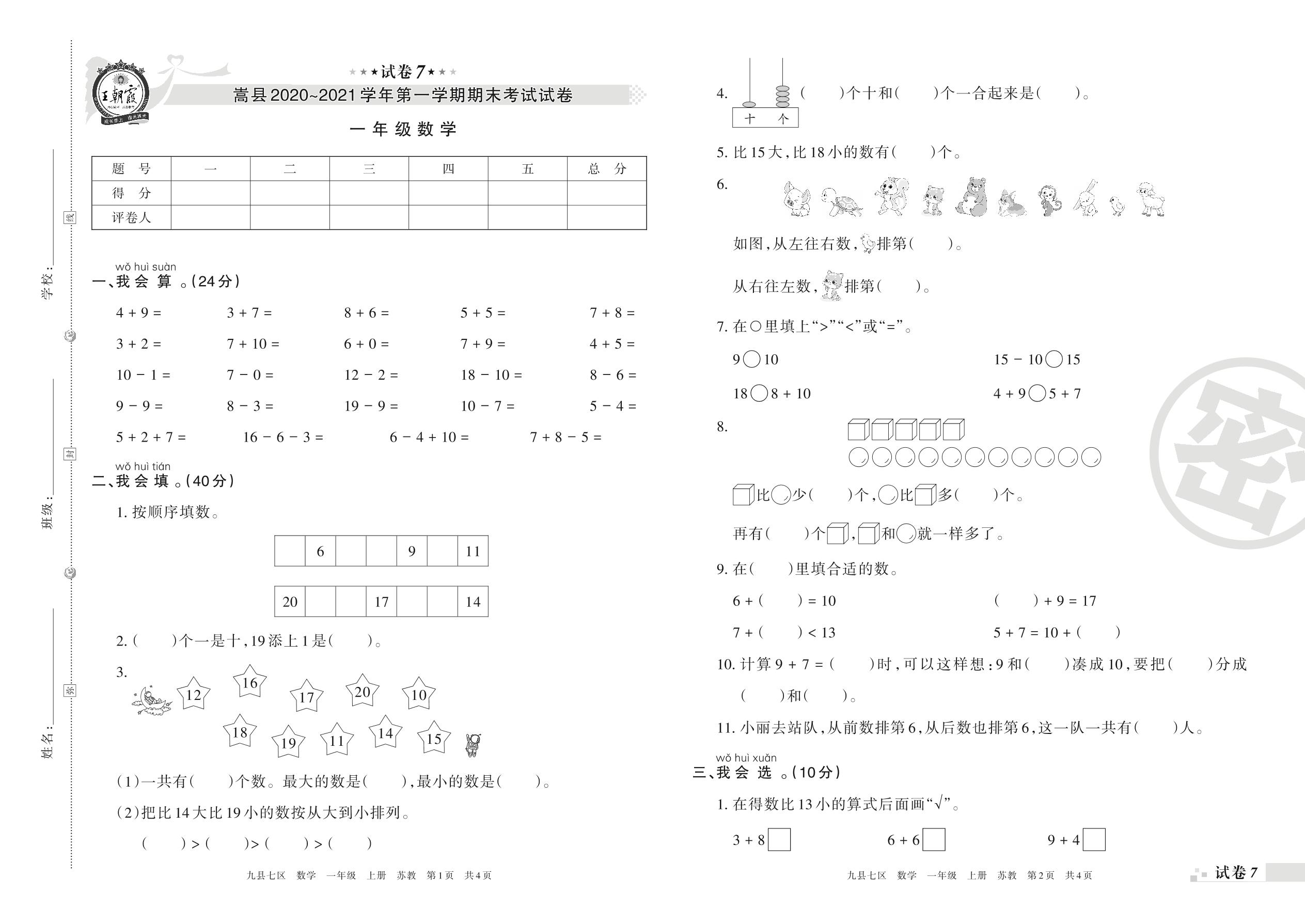 嵩县2020~2021学年第一学期期末考试试卷一年级数学(苏教版)【7】