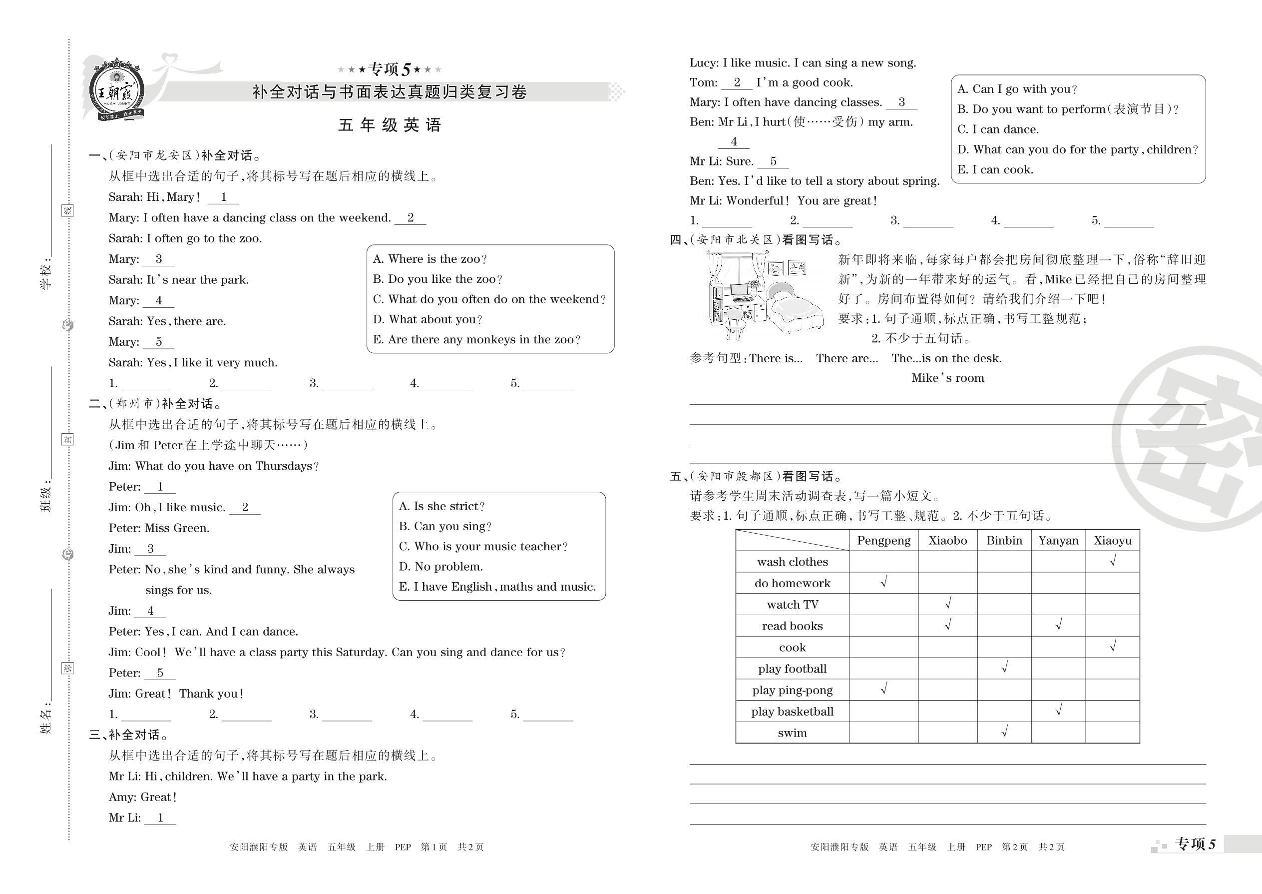 王朝霞期末专项卷——补全对话与书面表达真题归类复习卷五年级上册英语(人教PEP版)【5】
