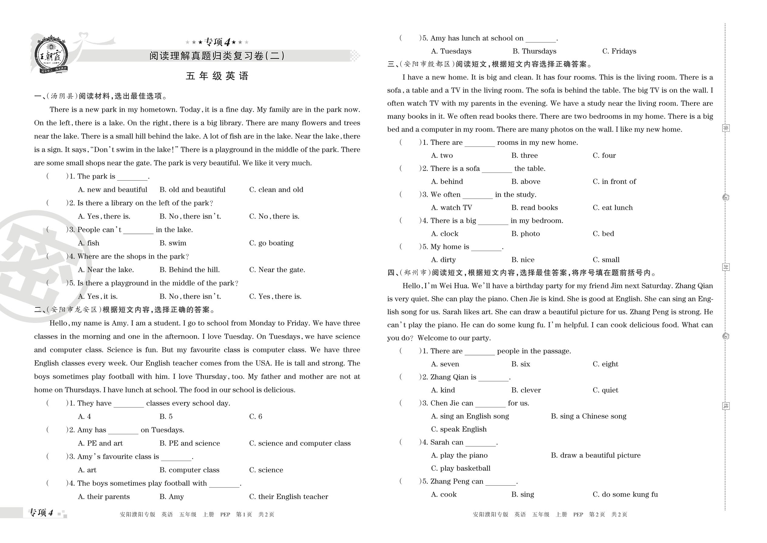 王朝霞期末专项卷——阅读理解真题归类复习卷(二)五年级上册英语(人教PEP版)【4】