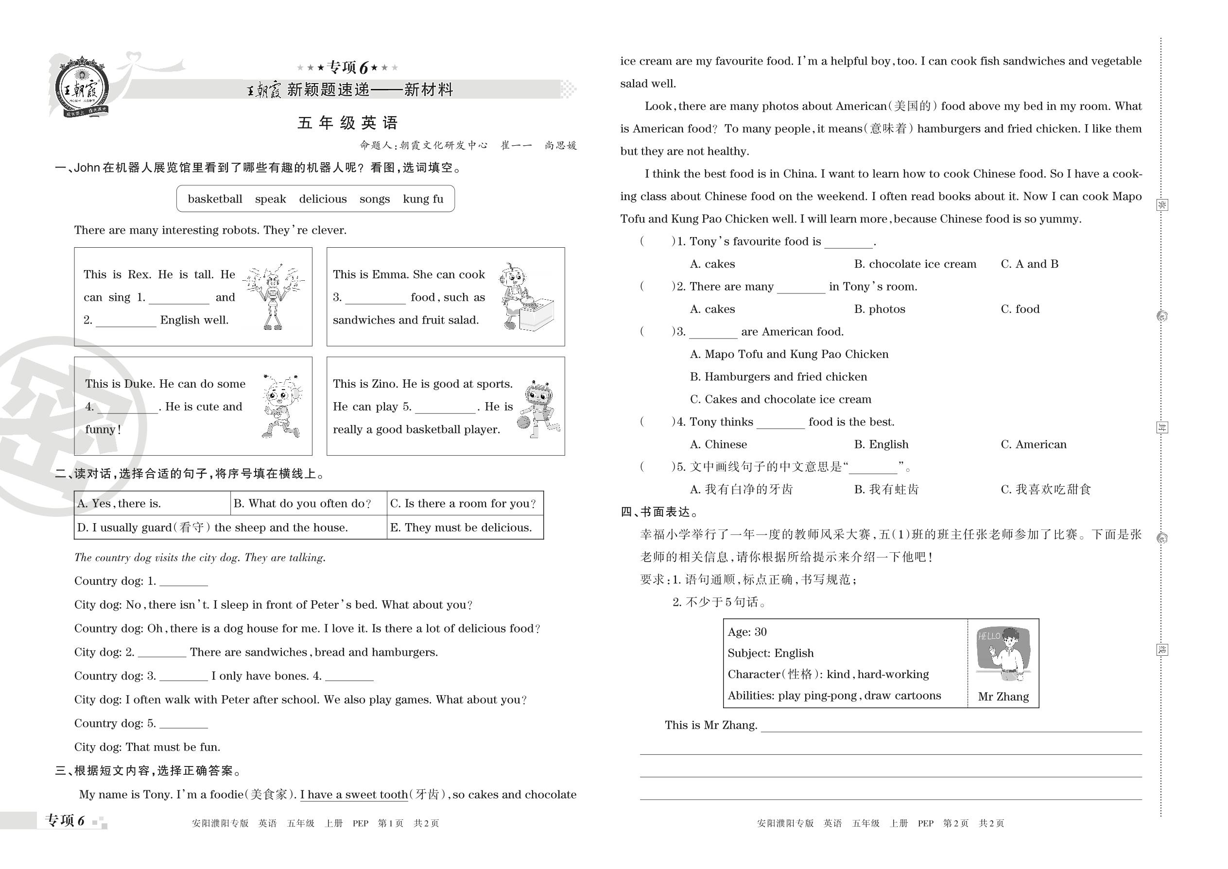 王朝霞期末专项卷——新颖题速递:新材料五年级上册英语(人教PEP版)【6】