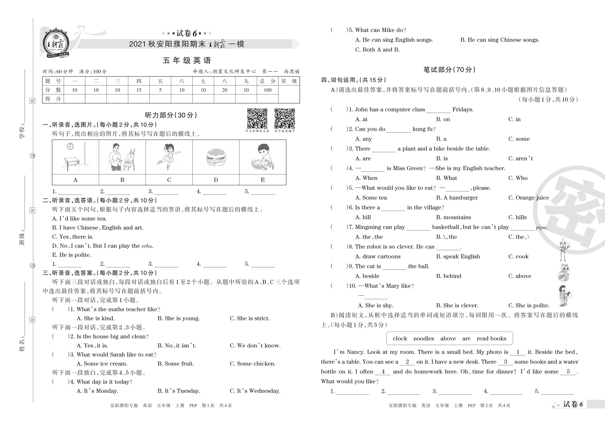 王朝霞期末模拟卷五年级上册英语(人教PEP版)【6】