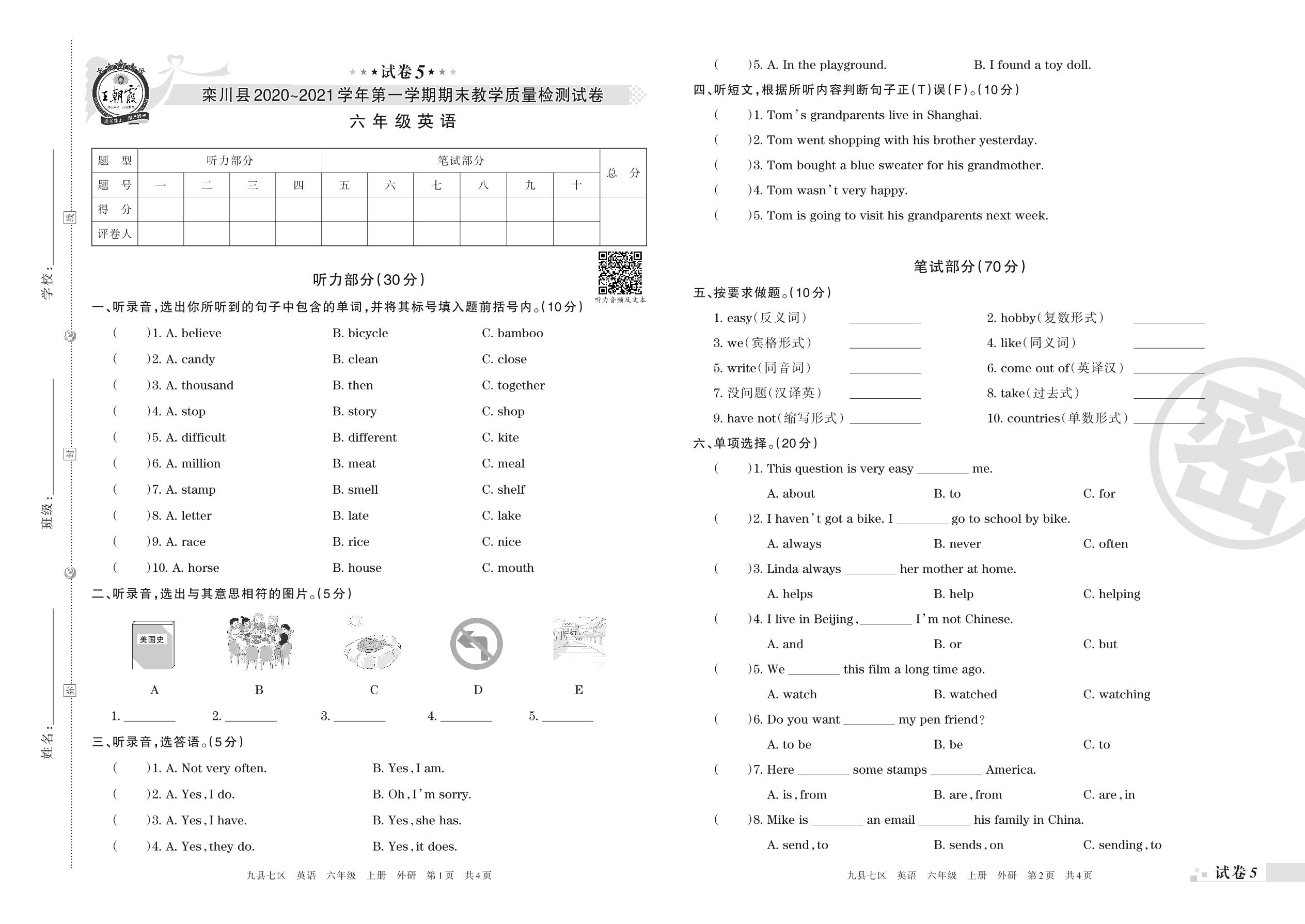 栾川县2020~2021学年第一学期期末教学质量检测试卷六年级英语(外研版)【5】