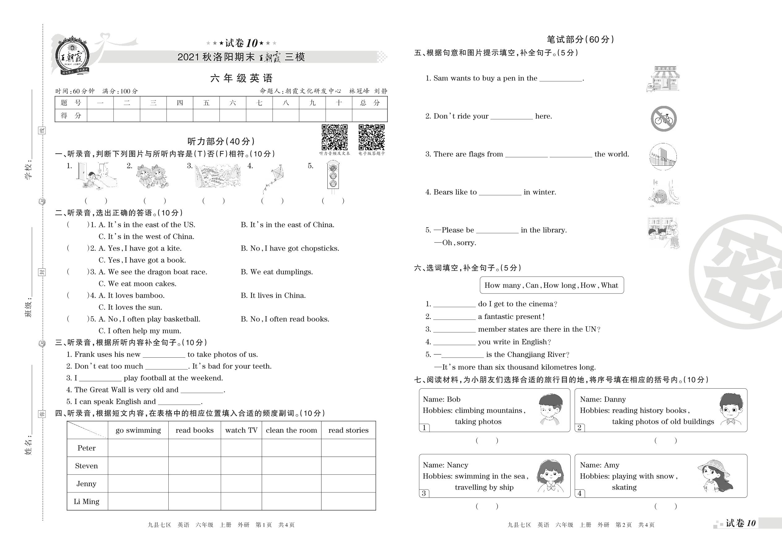 王朝霞期末模拟卷六年级上册英语(外研版)【10】