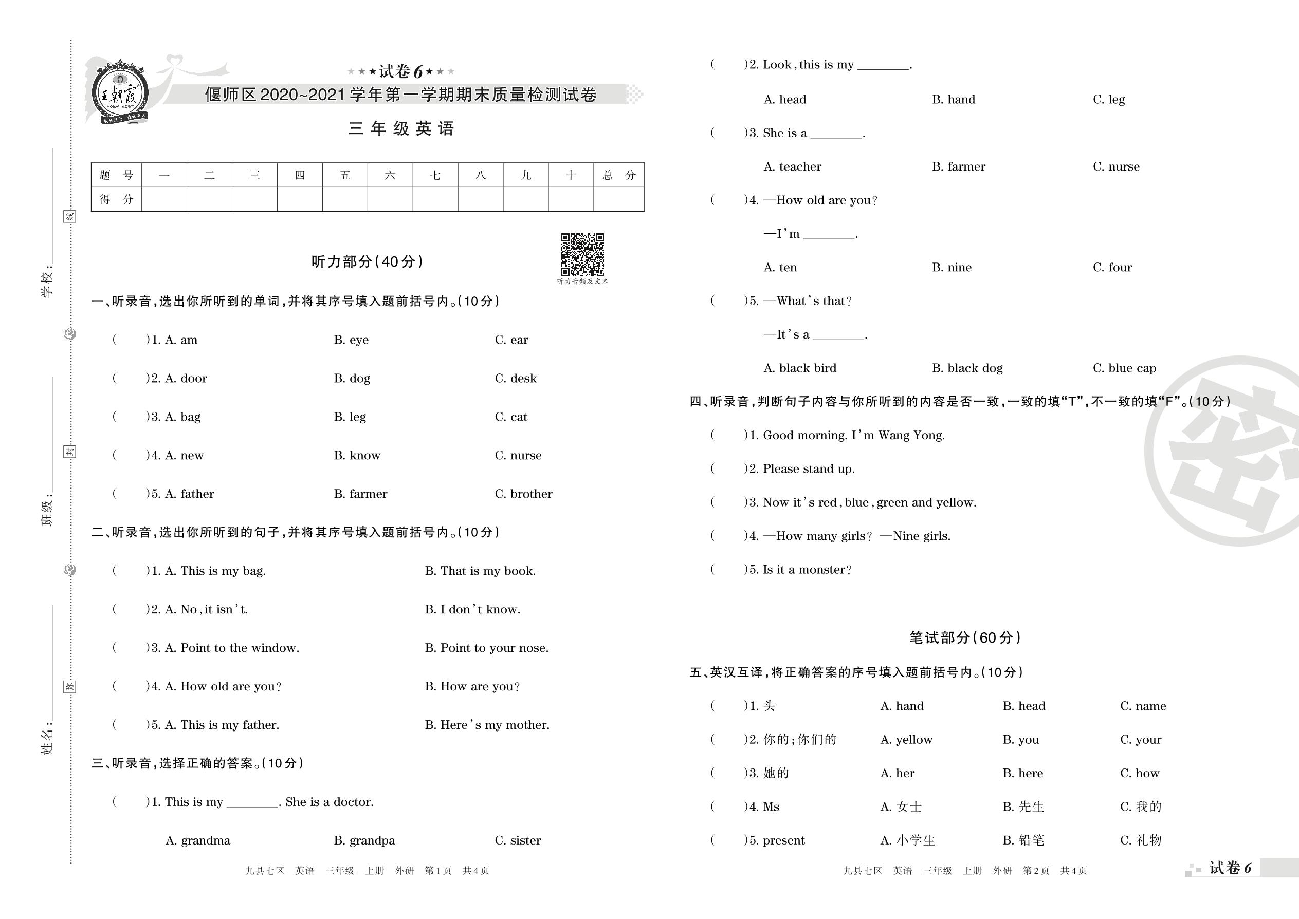 偃师区2020~2021学年第一学期期末质量检测试卷三年级英语(外研版)【6】