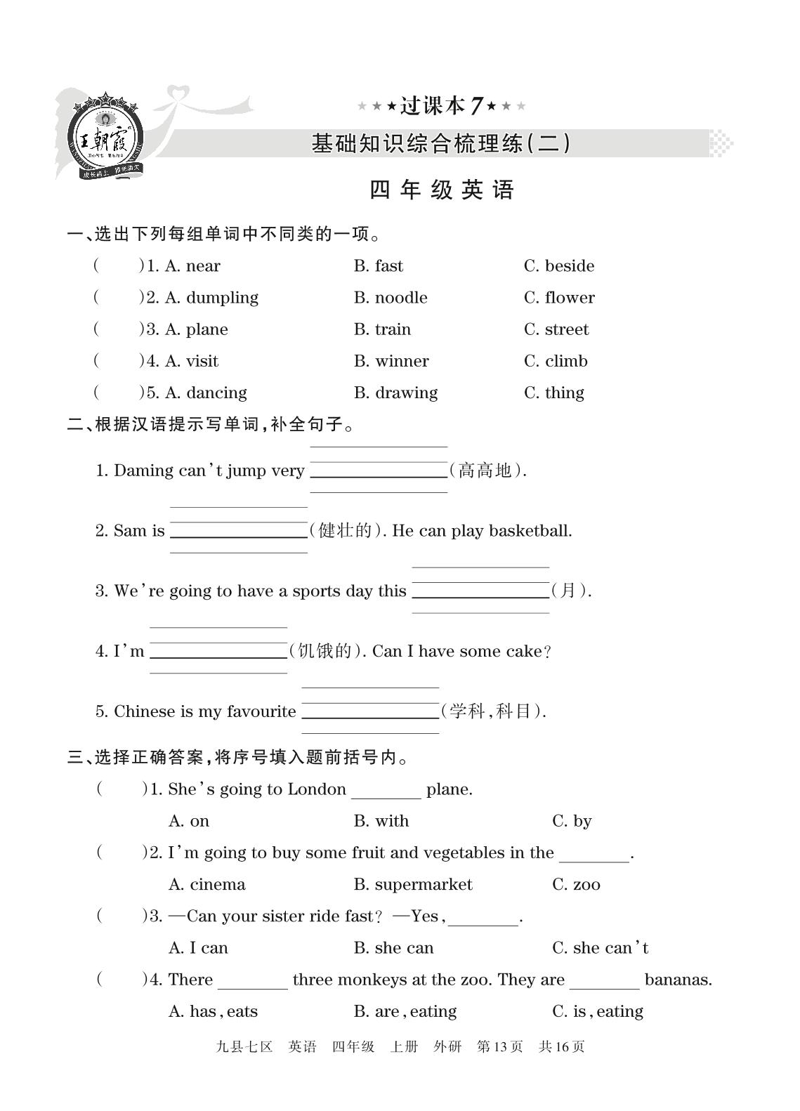 王朝霞期末过课本——基础知识综合梳理练(二)四年级上册英语(外研版)【7】