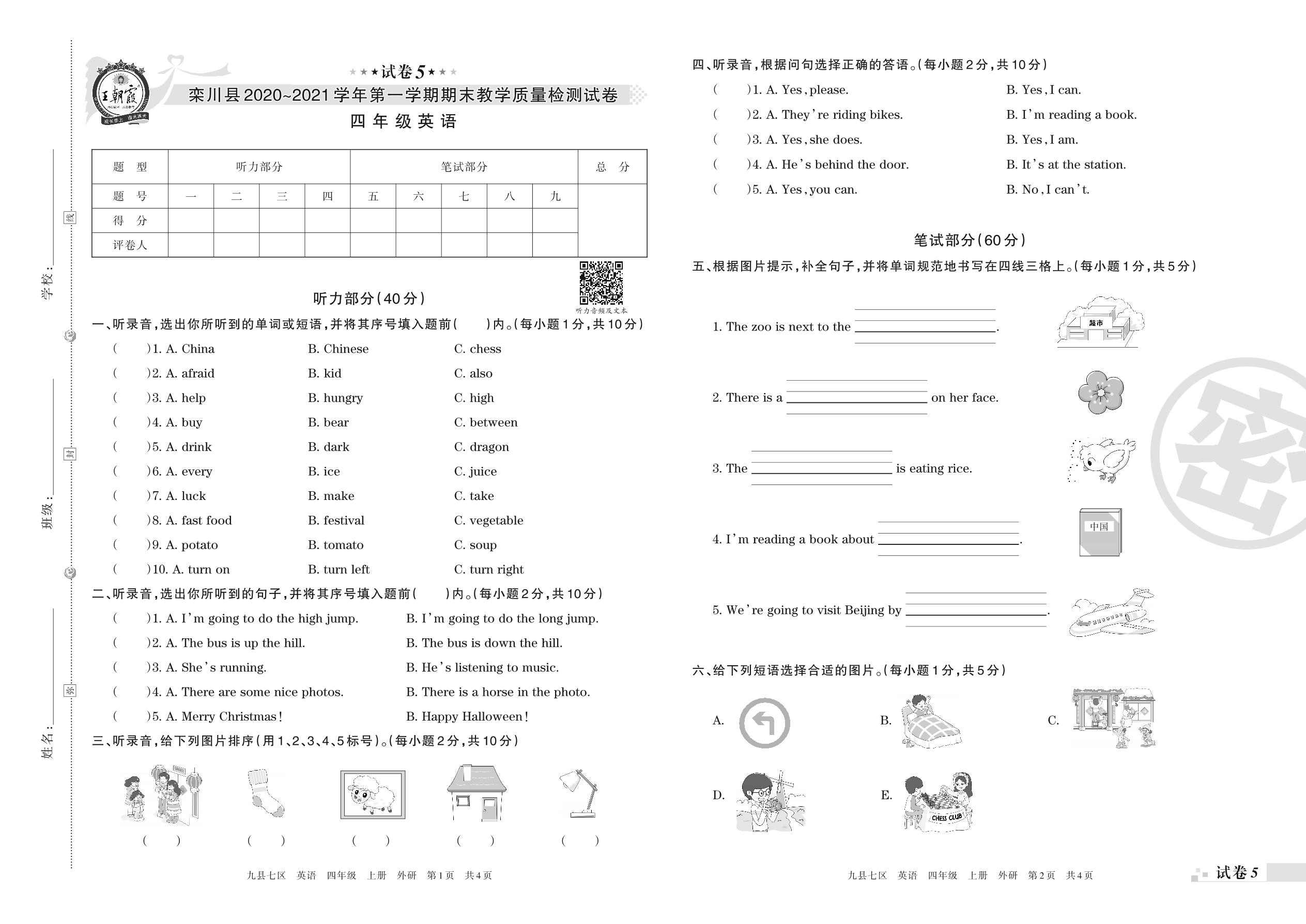 栾川县2020~2021学年第一学期期末教学质量检测试卷四年级英语(外研版)【5】