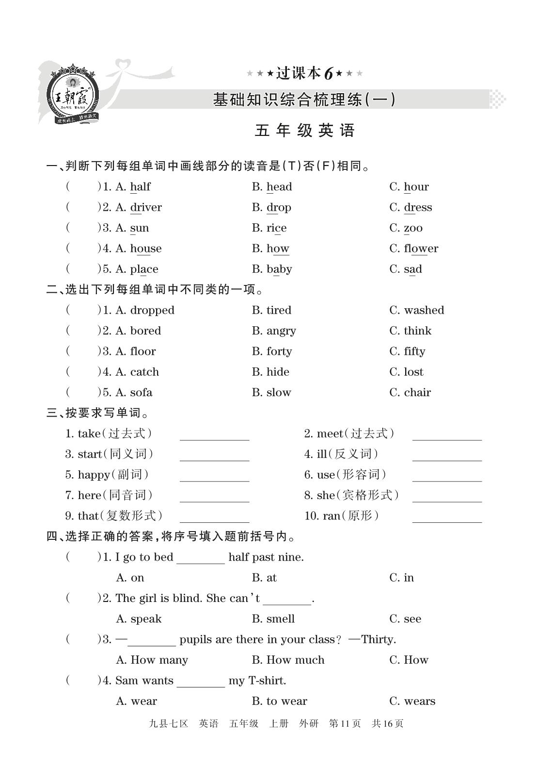 王朝霞期末过课本——基础知识综合梳理练(一)五年级上册英语(外研版)【6】