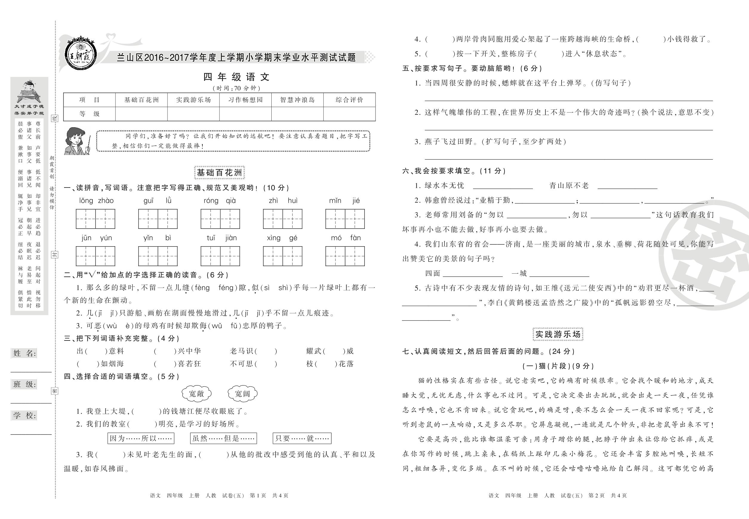 2016-2017学年第一学期临沂市兰山区四年级语文试卷(人教版)【5】