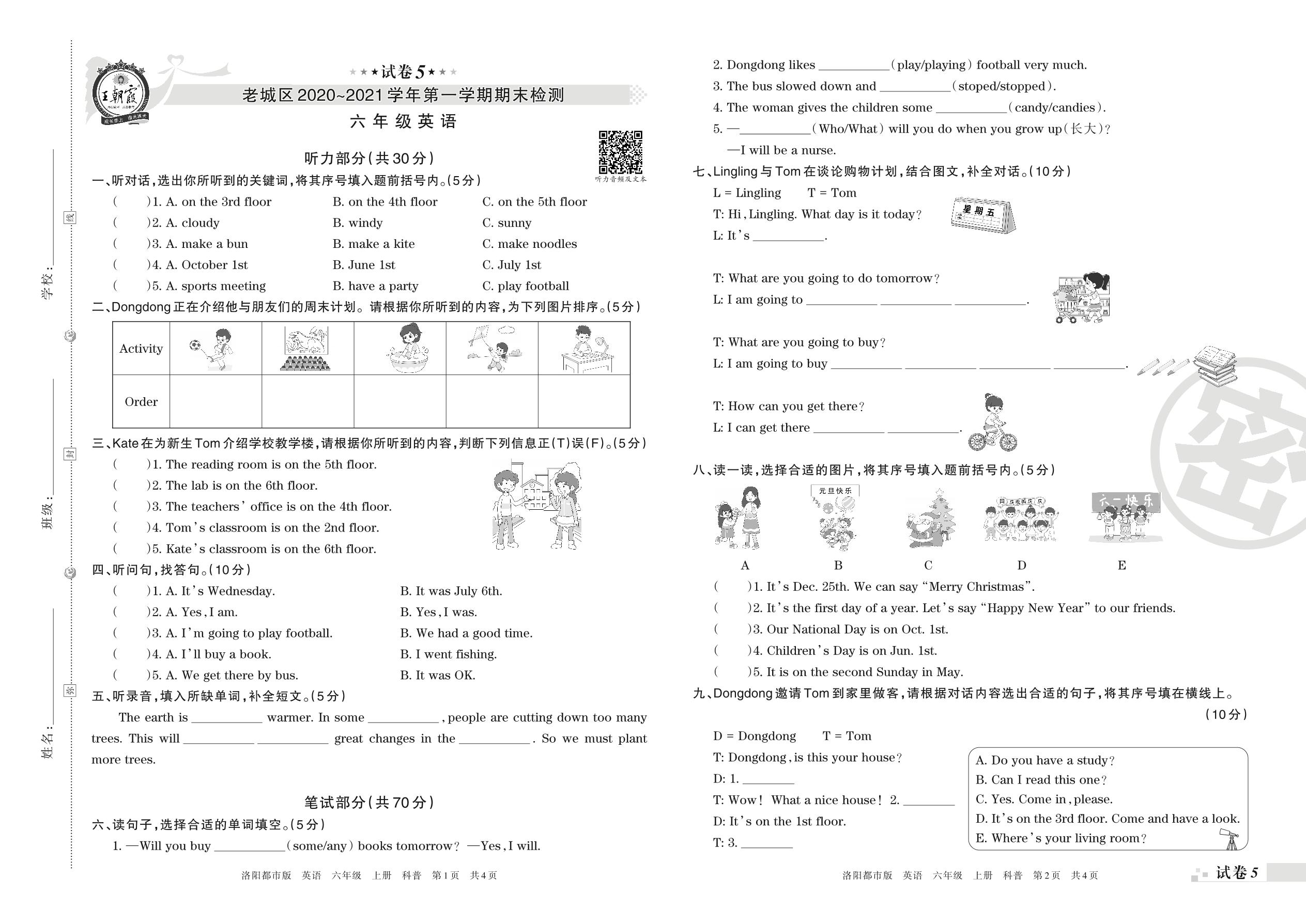 老城区2020~2021学年第一学期期末检测六年级英语(科普版)【5】
