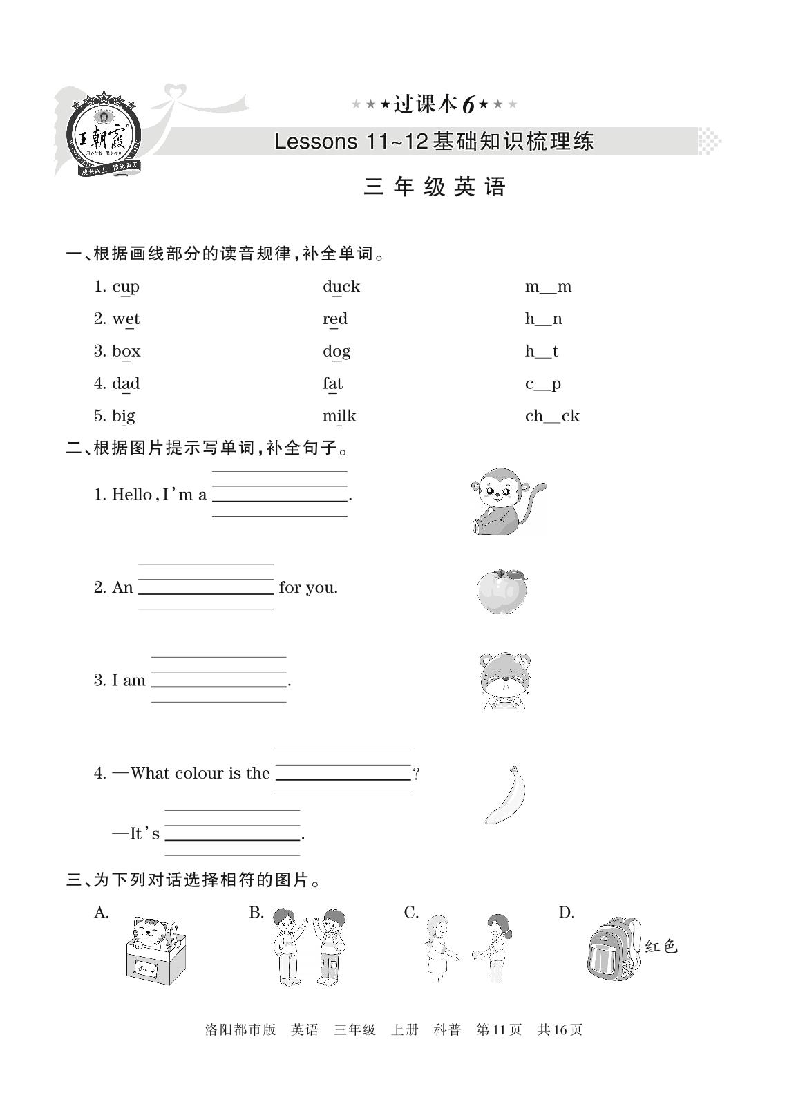王朝霞期末过课本——Lessons 11~12基础知识梳理练三年级上册英语(科普版)【6】