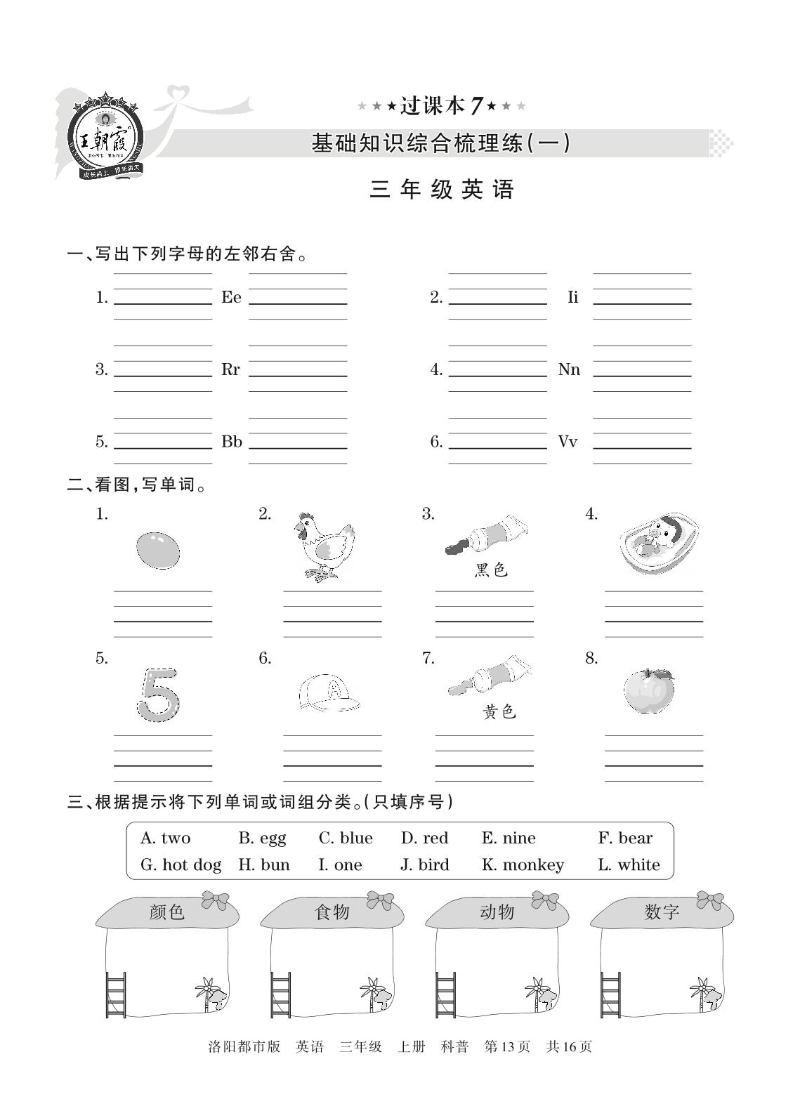王朝霞期末过课本——基础知识综合梳理练(一)三年级上册英语(科普版)【7】