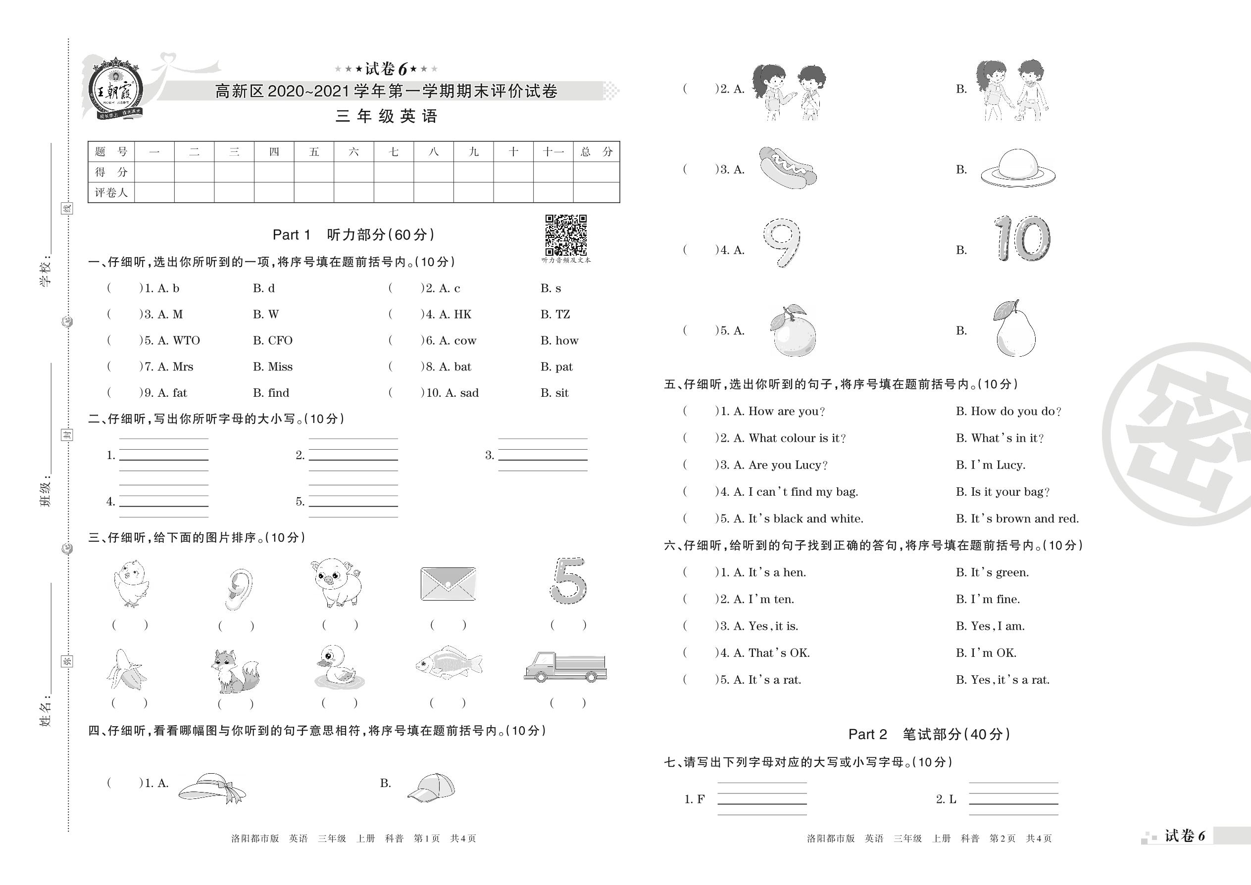 高新区2020~2021学年第一学期期末评价试卷三年级英语(科普版)【6】