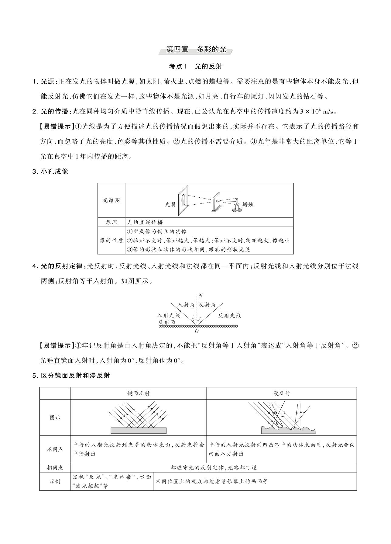 王朝霞期末知识梳理——第四章 多彩的光八年级上册物理(沪科版)【4】