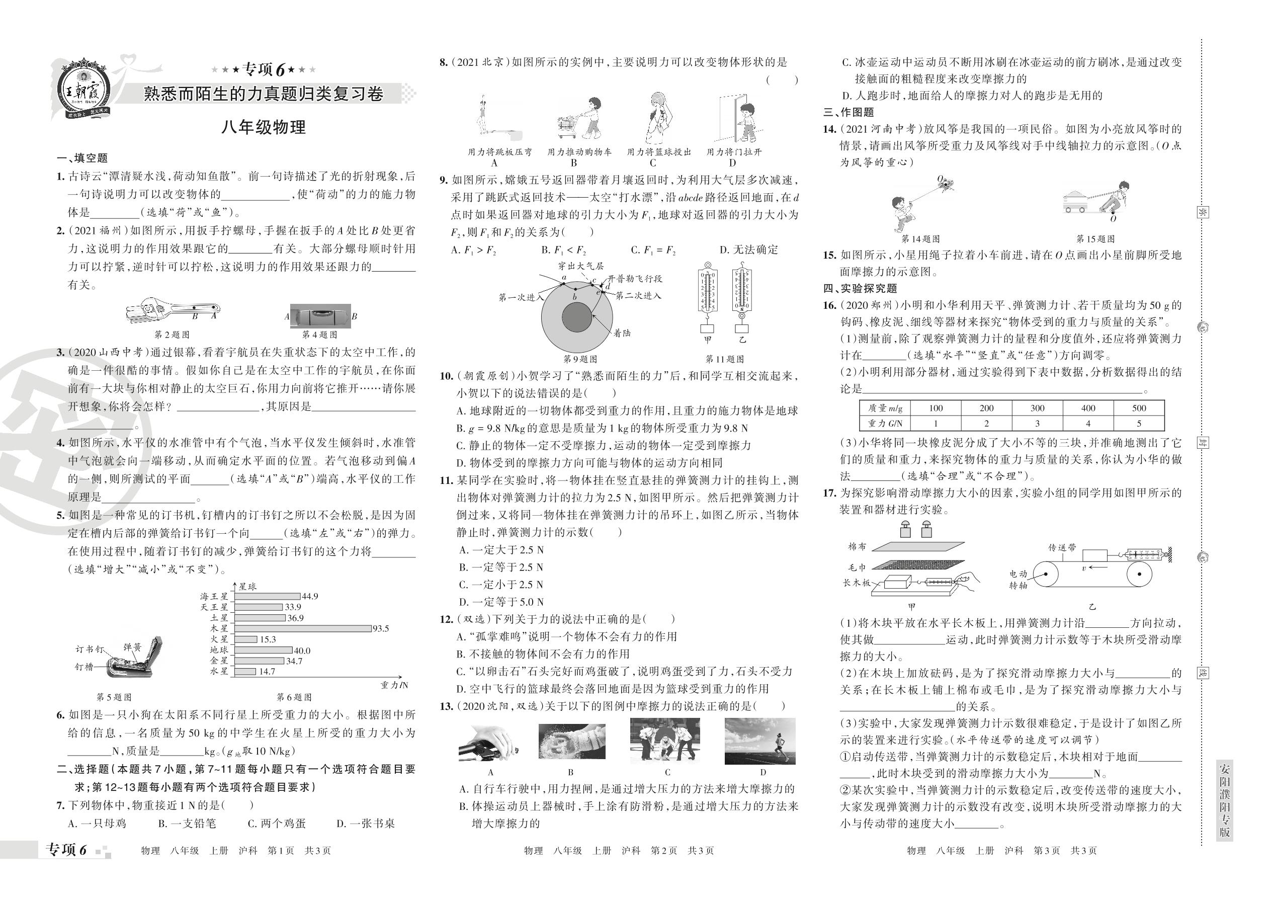 王朝霞期末专项卷——熟悉而陌生的力真题归类复习卷八年级上册物理(沪科版)【6】