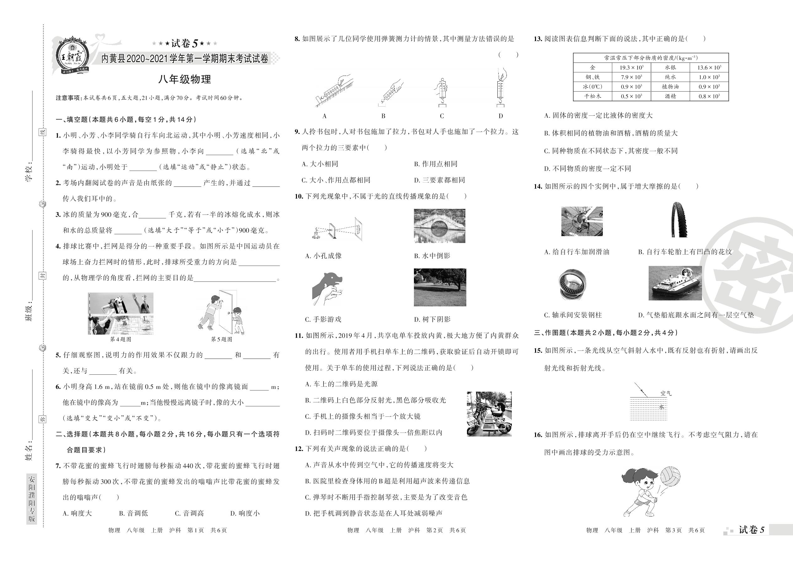 内黄县2020~2021学年第一学期期末考试试卷八年级物理(沪科版)【5】