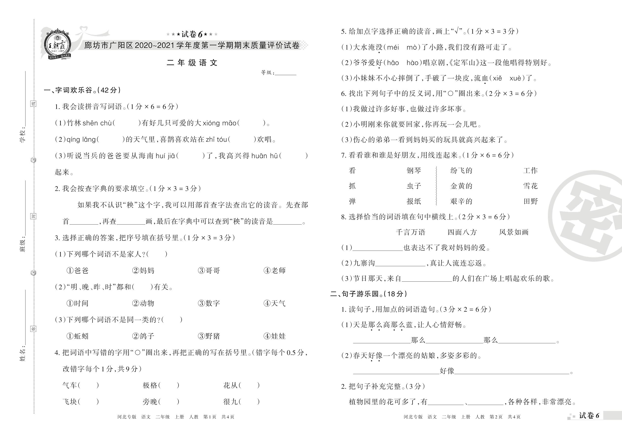 廊坊市广阳区2020~2021学年度第一学期期末质量评价试卷二年级语文(人教版)【6】