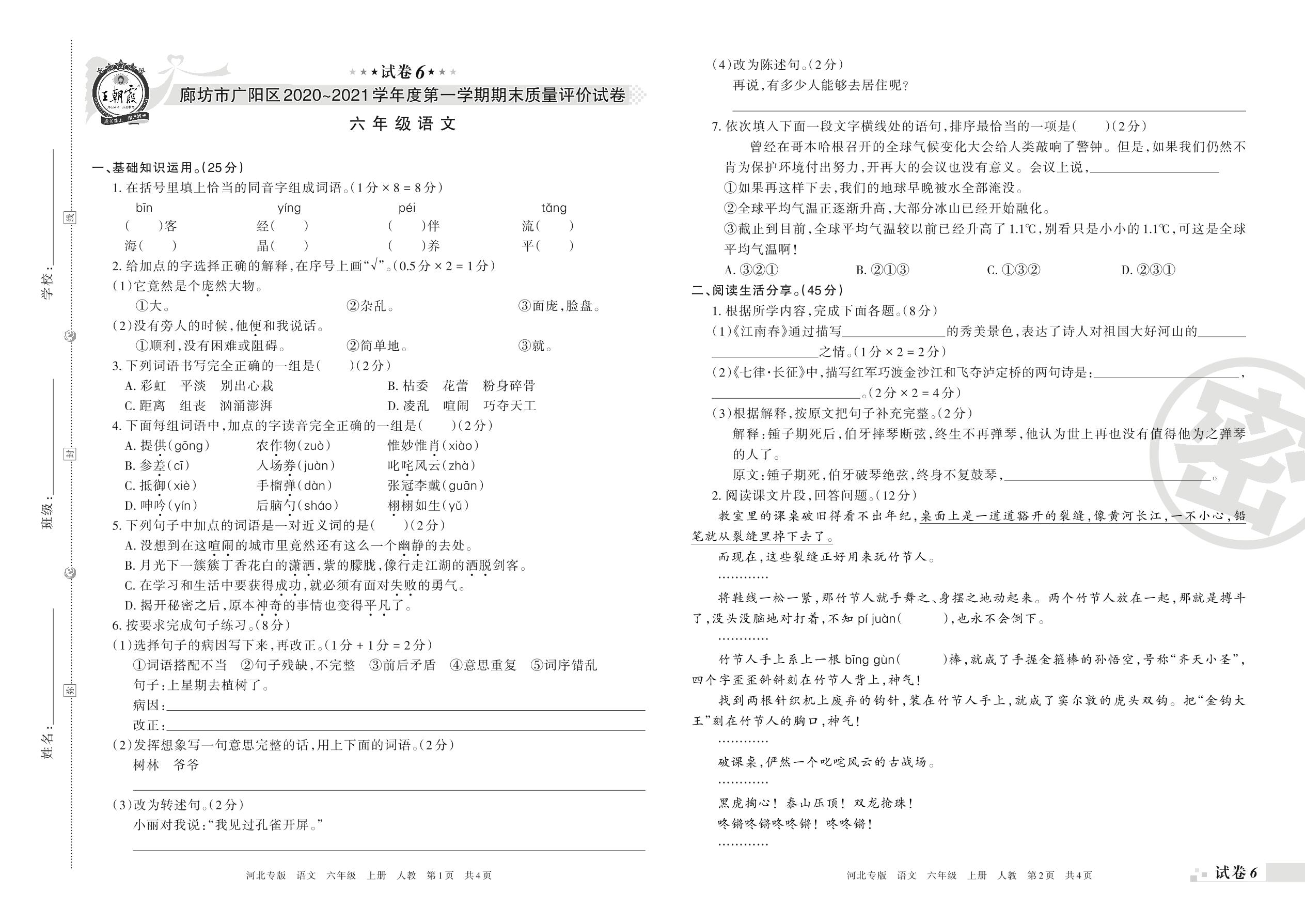 廊坊市广阳区2020~2021学年度第一学期期末质量评价试卷六年级语文(人教版)【6】