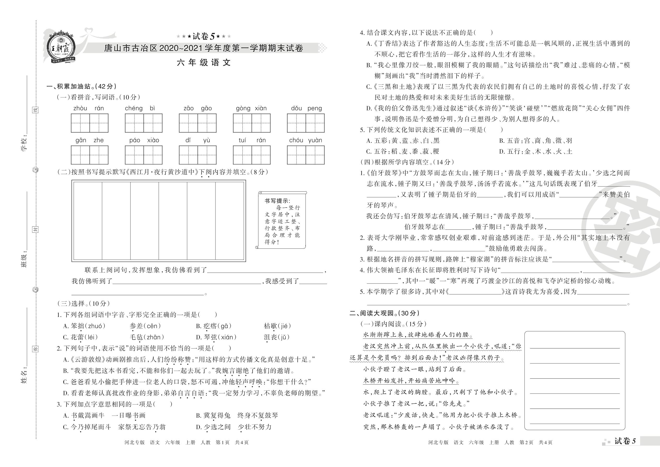 唐山市古冶区2020~2021学年度第一学期期末试卷六年级语文(人教版)【5】