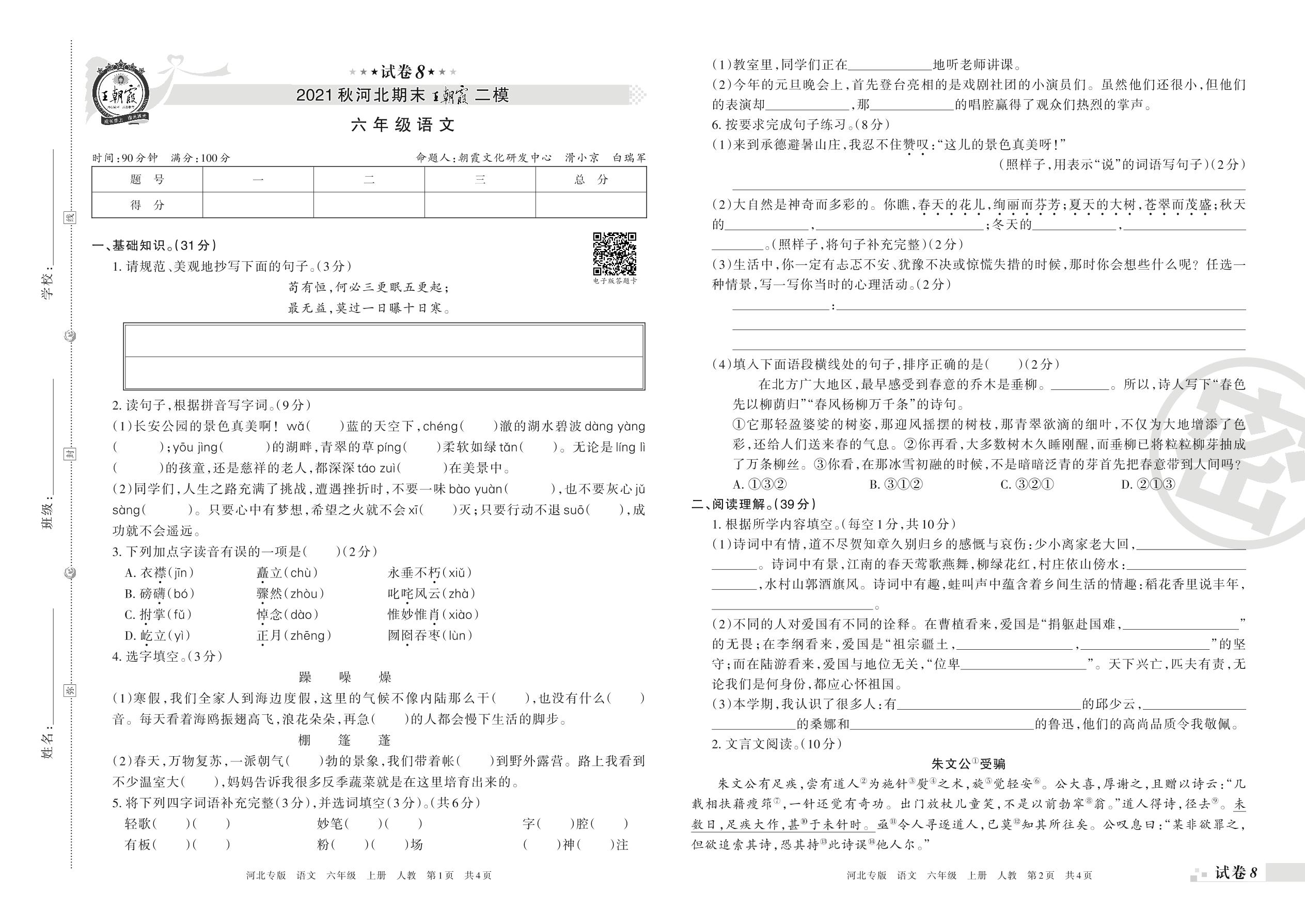 王朝霞期末模拟卷六年级上册语文(人教版)_R211224085307281【8】