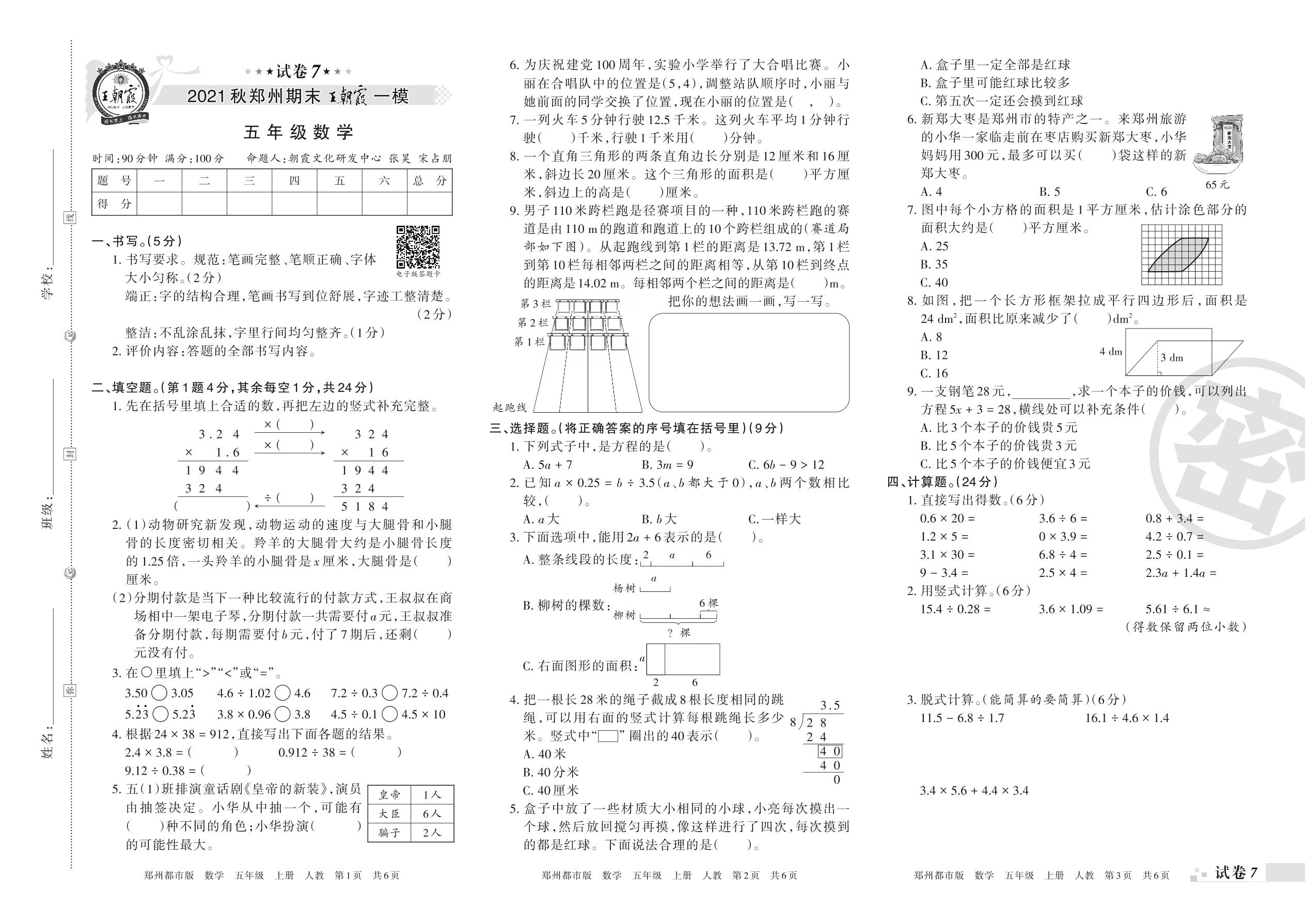 王朝霞期末模拟卷五年级上册数学(人教版)_R211224085550588【7】