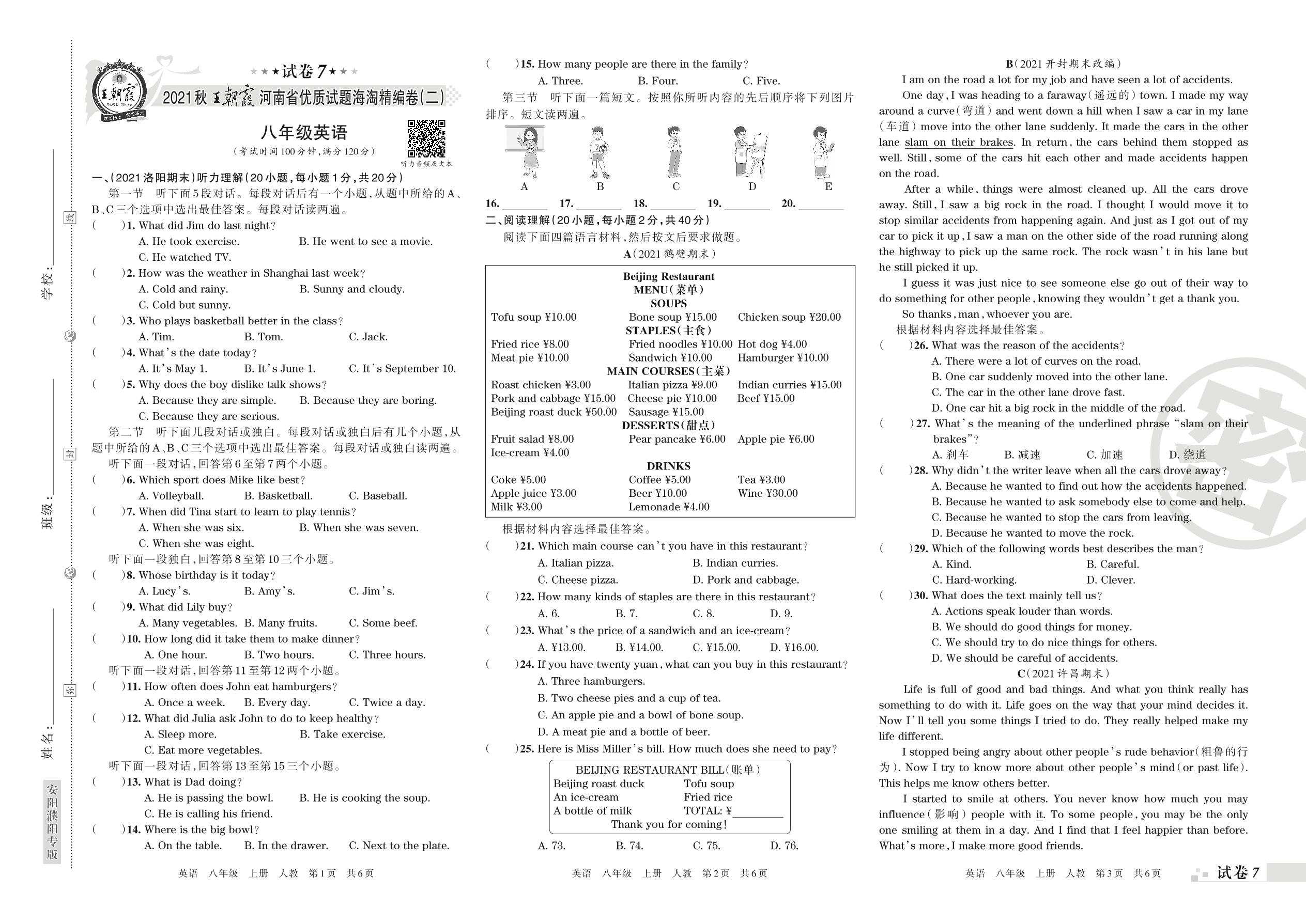 河南省优质试题海淘精编卷(二)八年级上册英语(人教版)【7】
