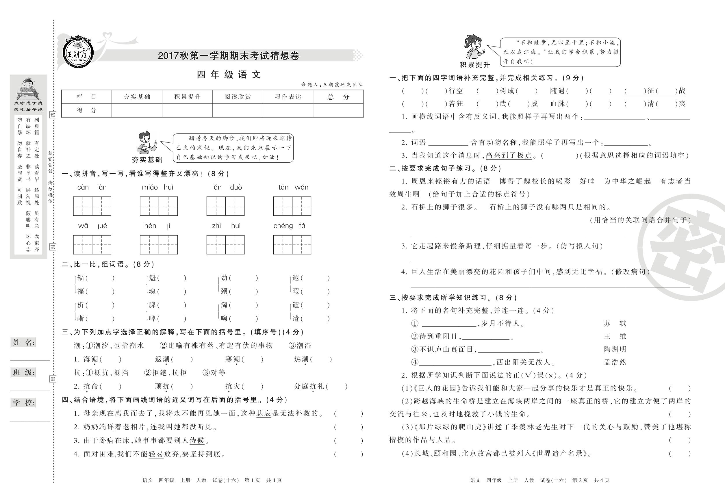 王朝霞期末猜想卷四年级上册语文(人教版)【16】