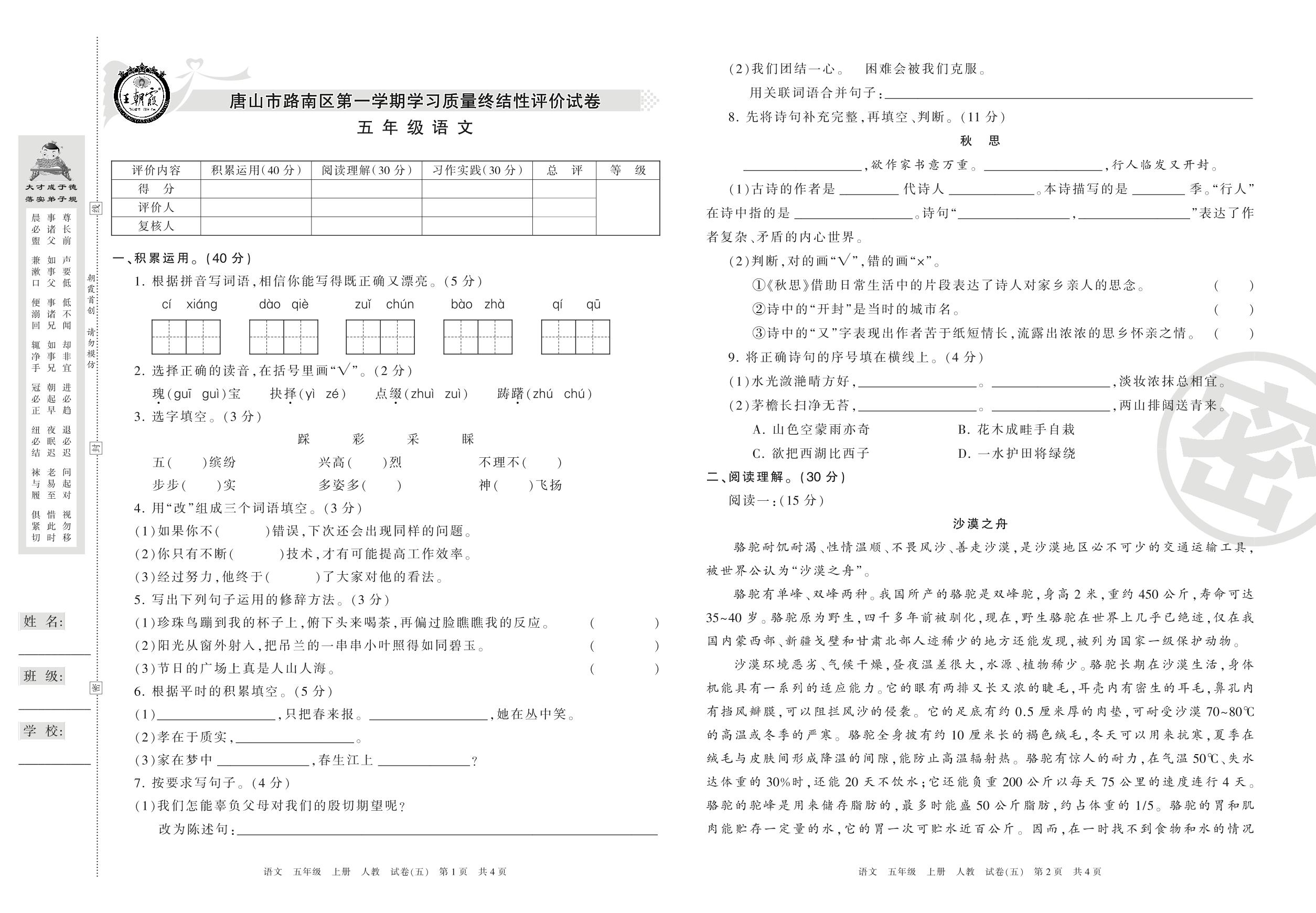 2016-2017学年第一学期唐山市路南区五年级语文试卷(人教版)【5】