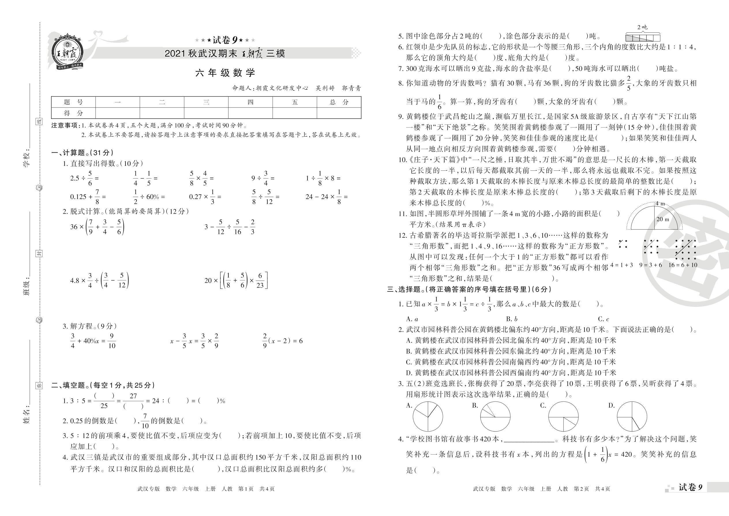王朝霞期末模拟卷六年级上册数学(人教版)_R211224090633509【9】