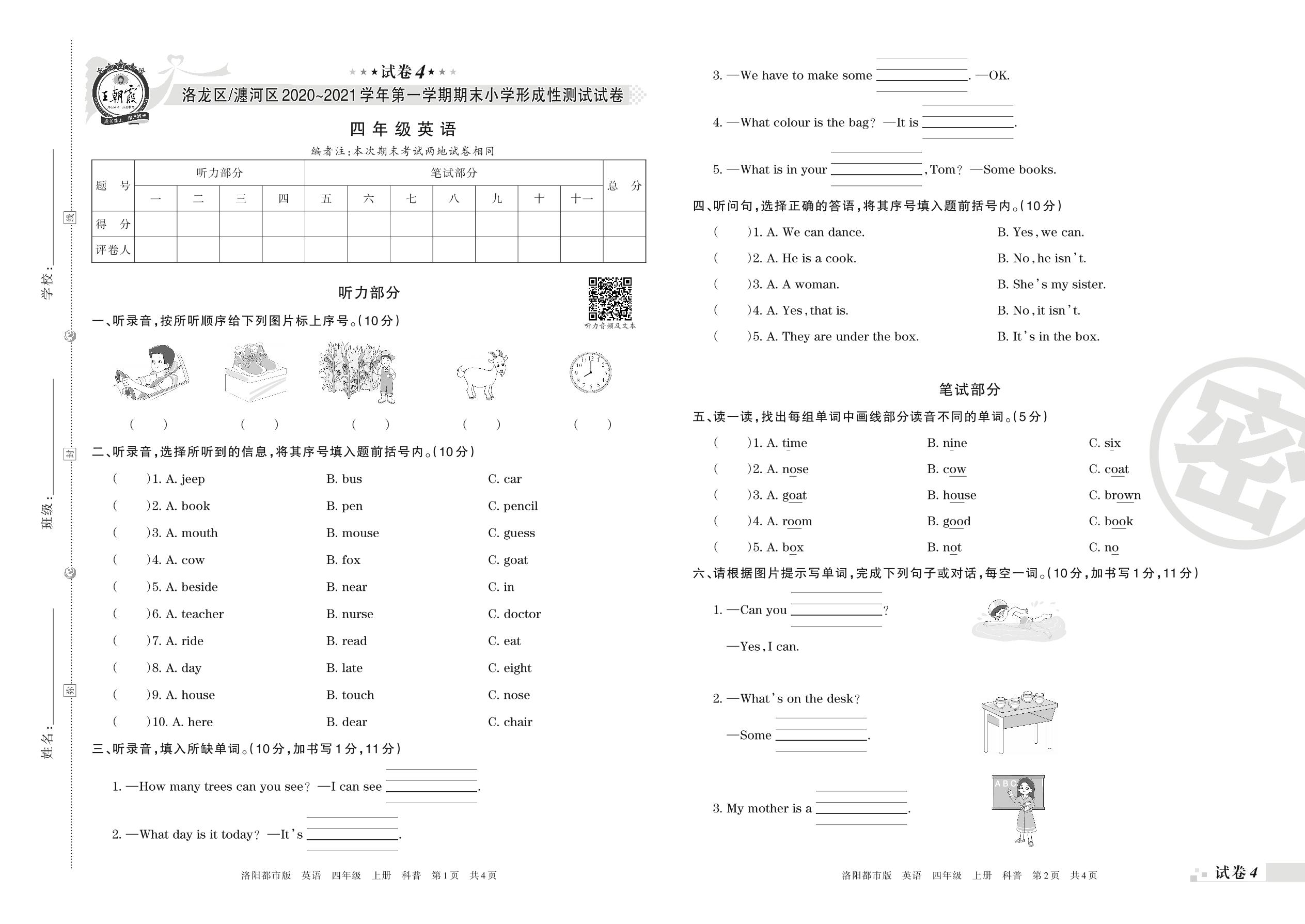 洛龙区、瀍河区2020~2021学年第一学期期末小学形成性测试试卷四年级英语(科普版)【4】