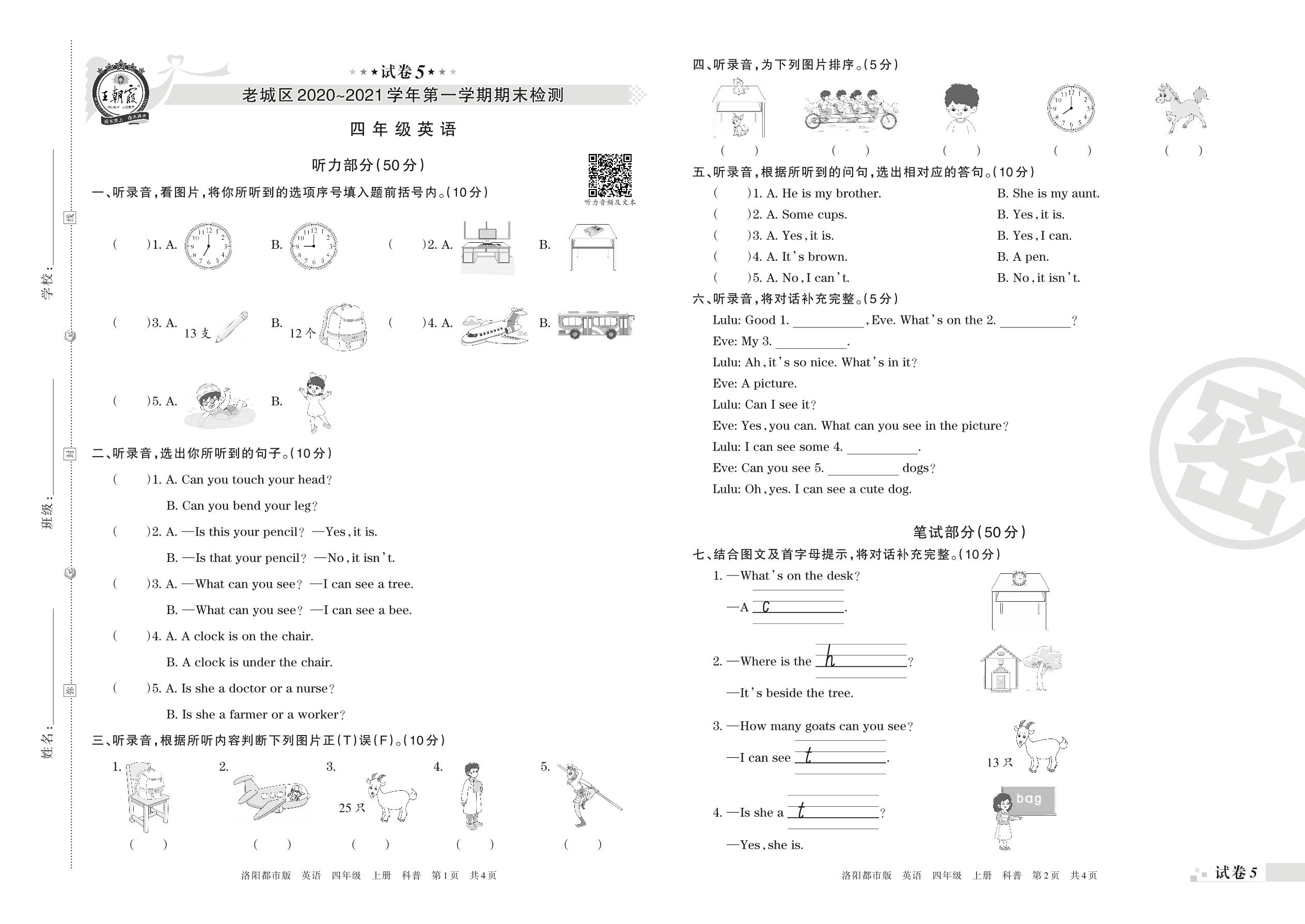 老城区2020~2021学年第一学期期末检测四年级英语(科普版)【5】
