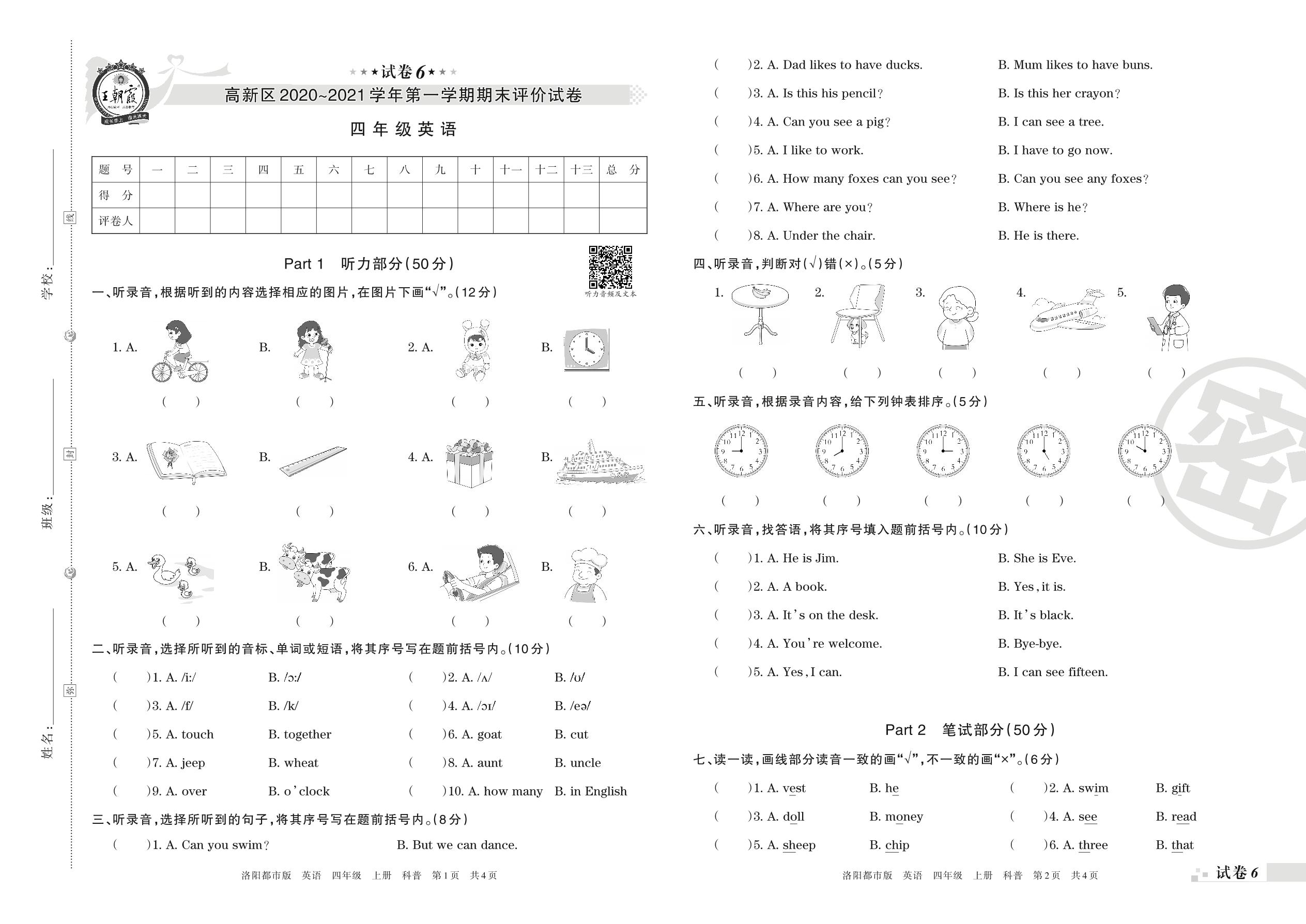 高新区2020~2021学年第一学期期末评价试卷四年级英语(科普版)【6】