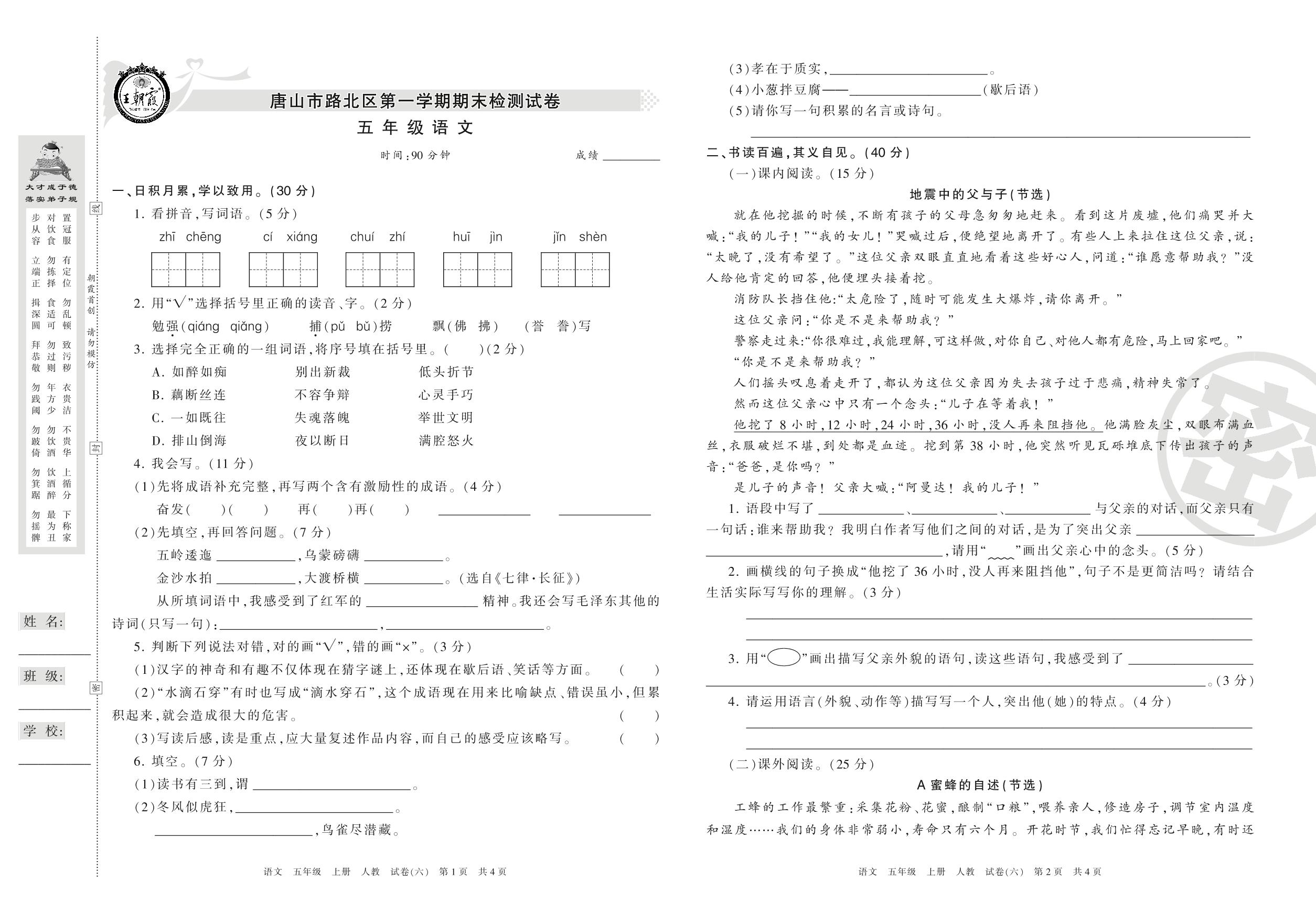 2016-2017学年第一学期唐山市路北区五年级语文试卷(人教版)【6】