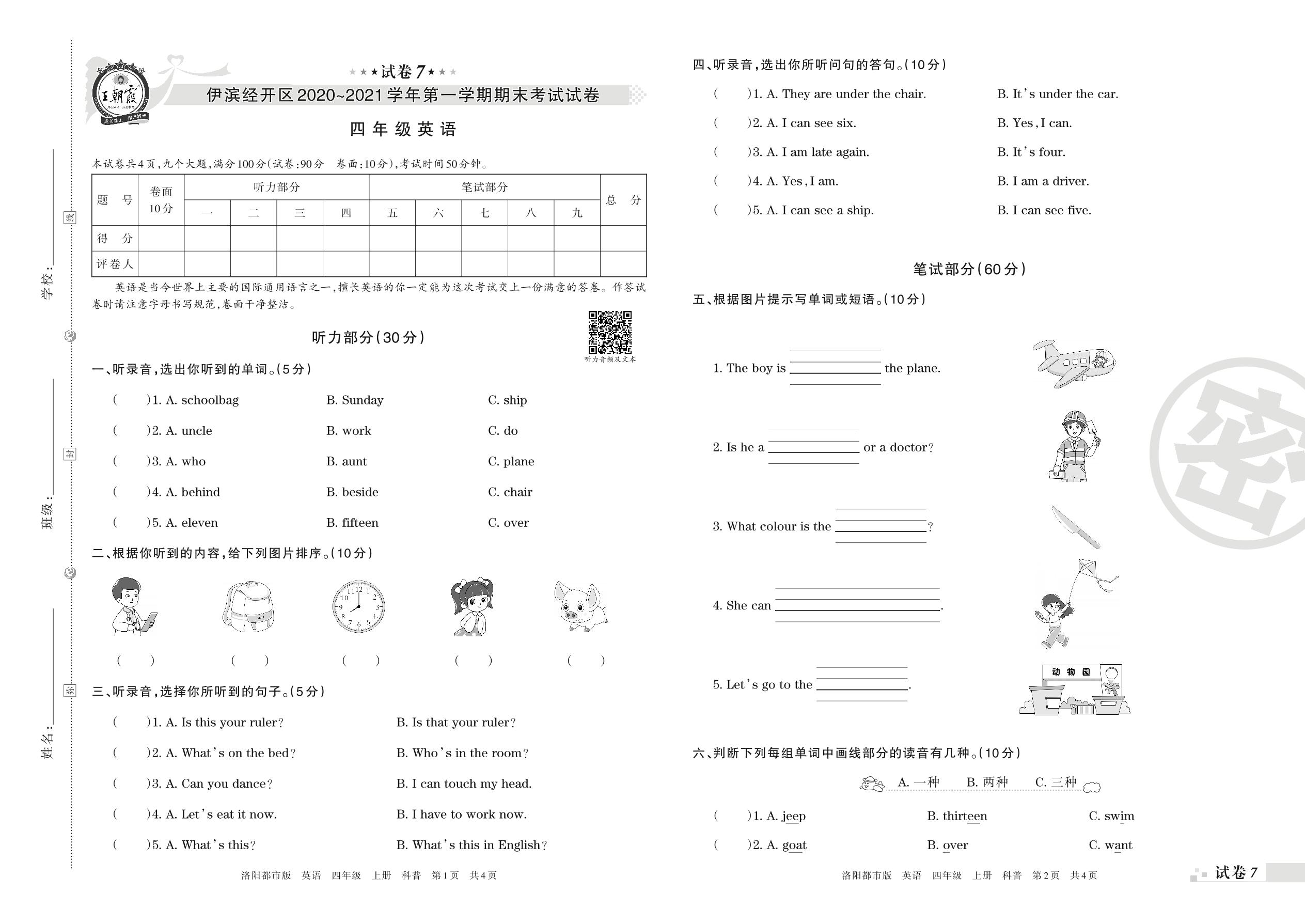 伊滨经开区2020~2021学年第一学期期末考试试卷四年级英语(科普版)【7】