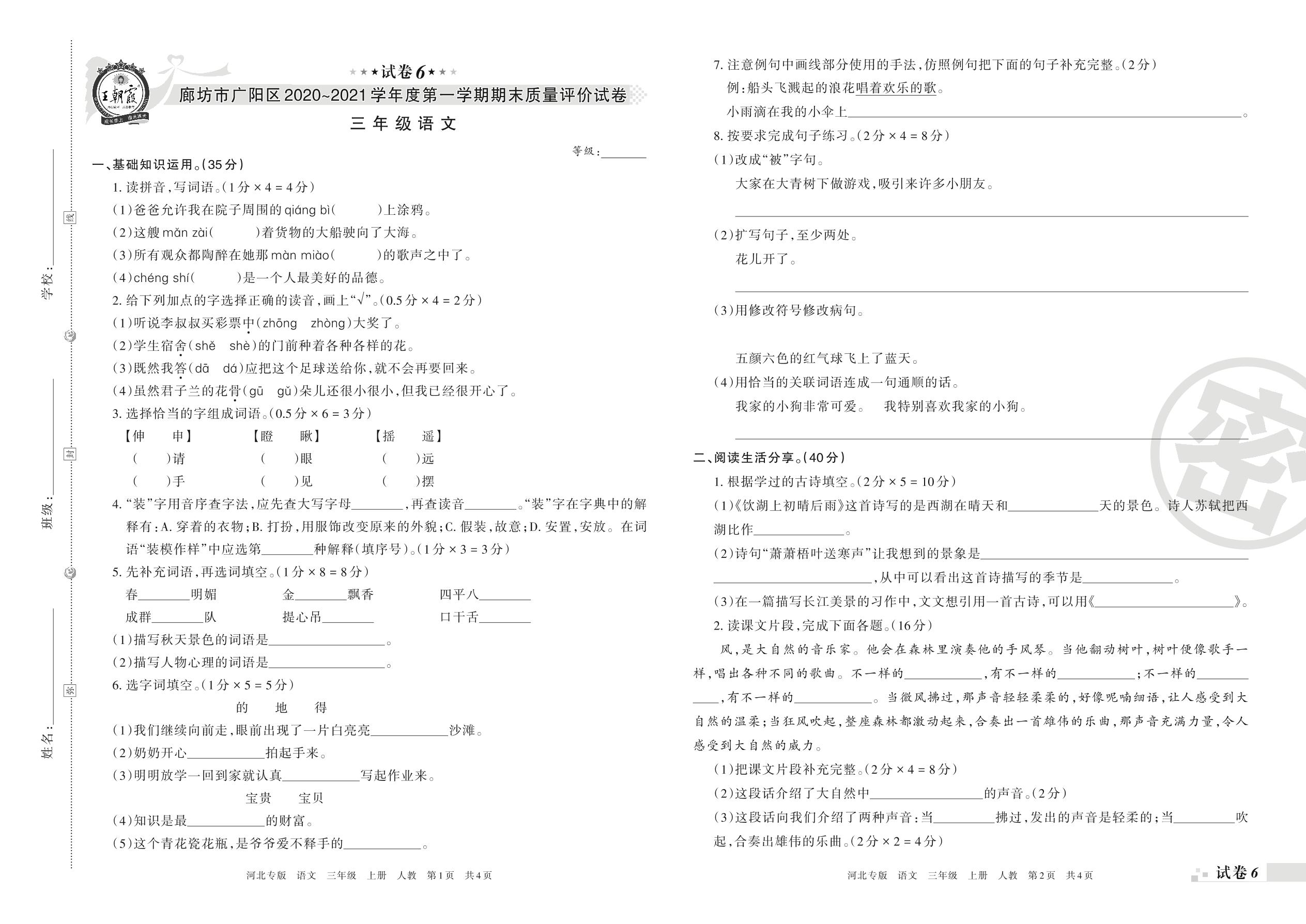 廊坊市广阳区2020~2021学年度第一学期期末质量评价试卷三年级语文(人教版)【6】