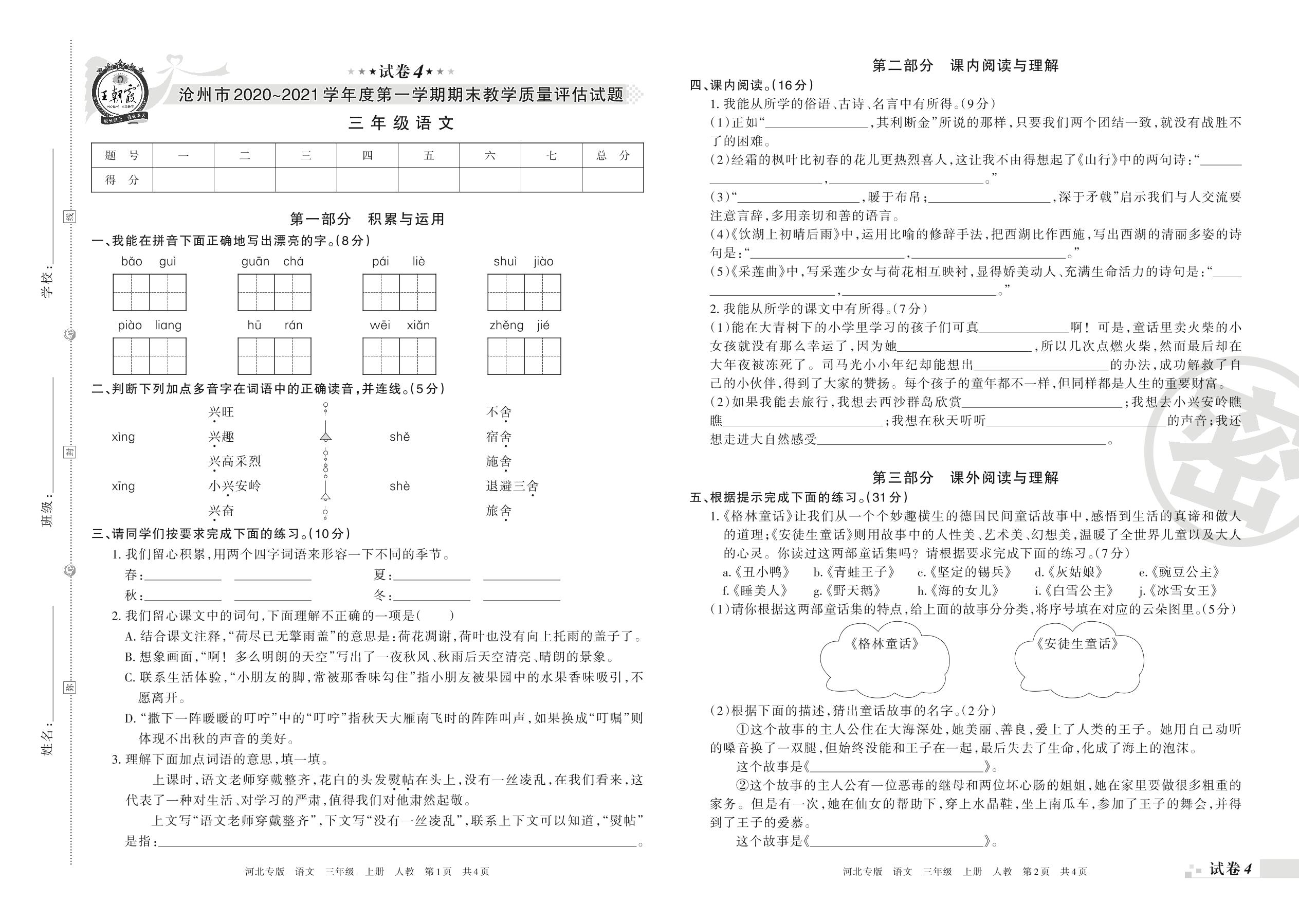 沧州市2020~2021学年度第一学期期末教学质量评估试题三年级语文(人教版)【4】