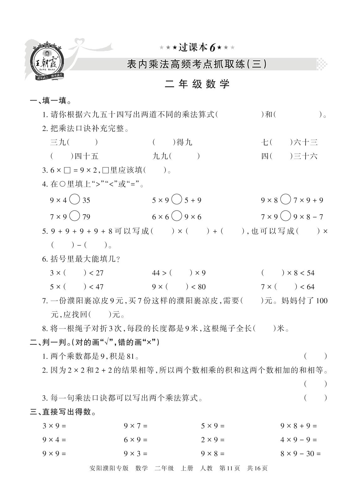 王朝霞期末过课本——表内乘法高频考点抓取练(三)二年级上册数学(人教版)_R211224091503858【6】