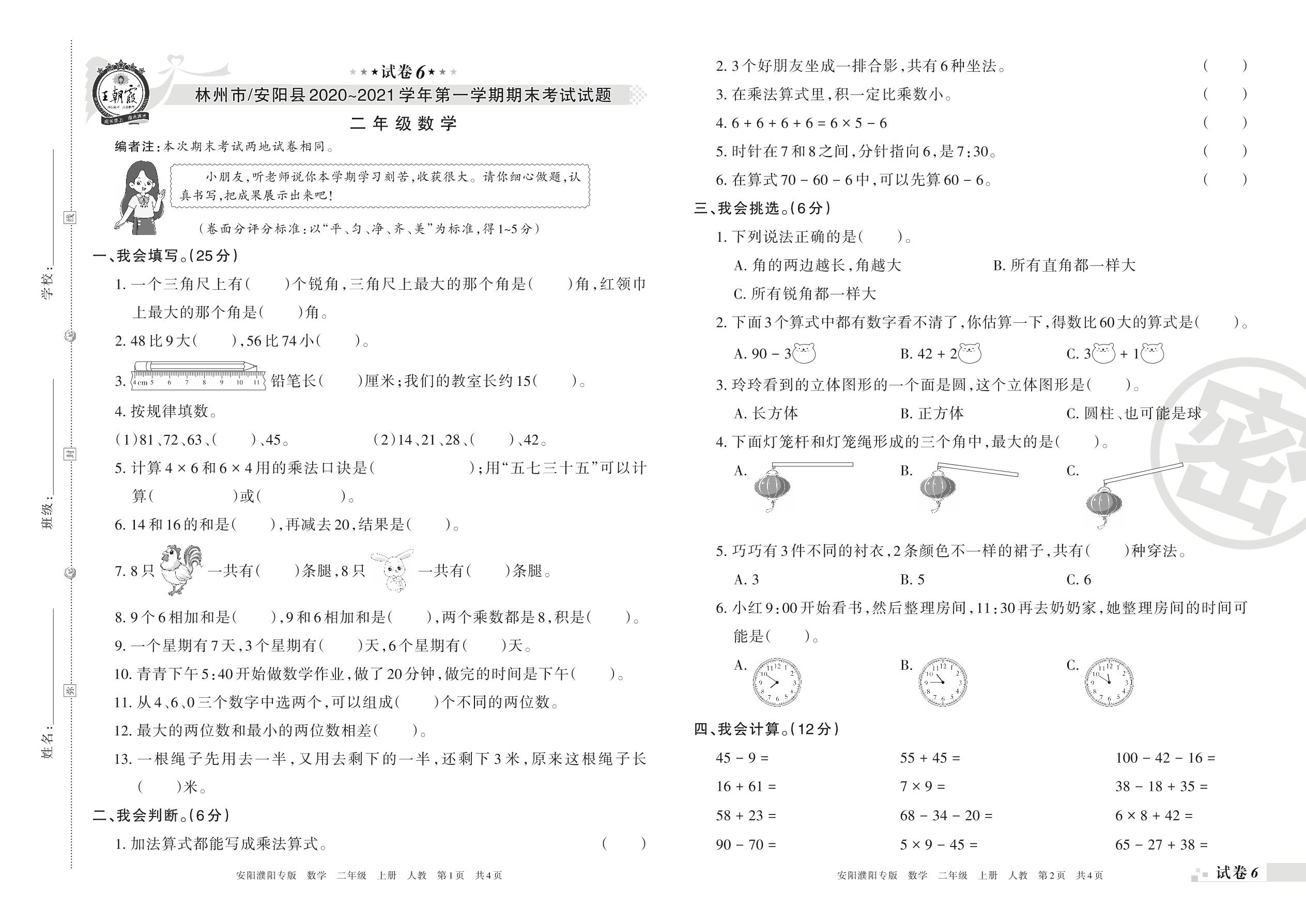 林州市、安阳县2020~2021学年第一学期期末考试试题二年级数学(人教版)【6】