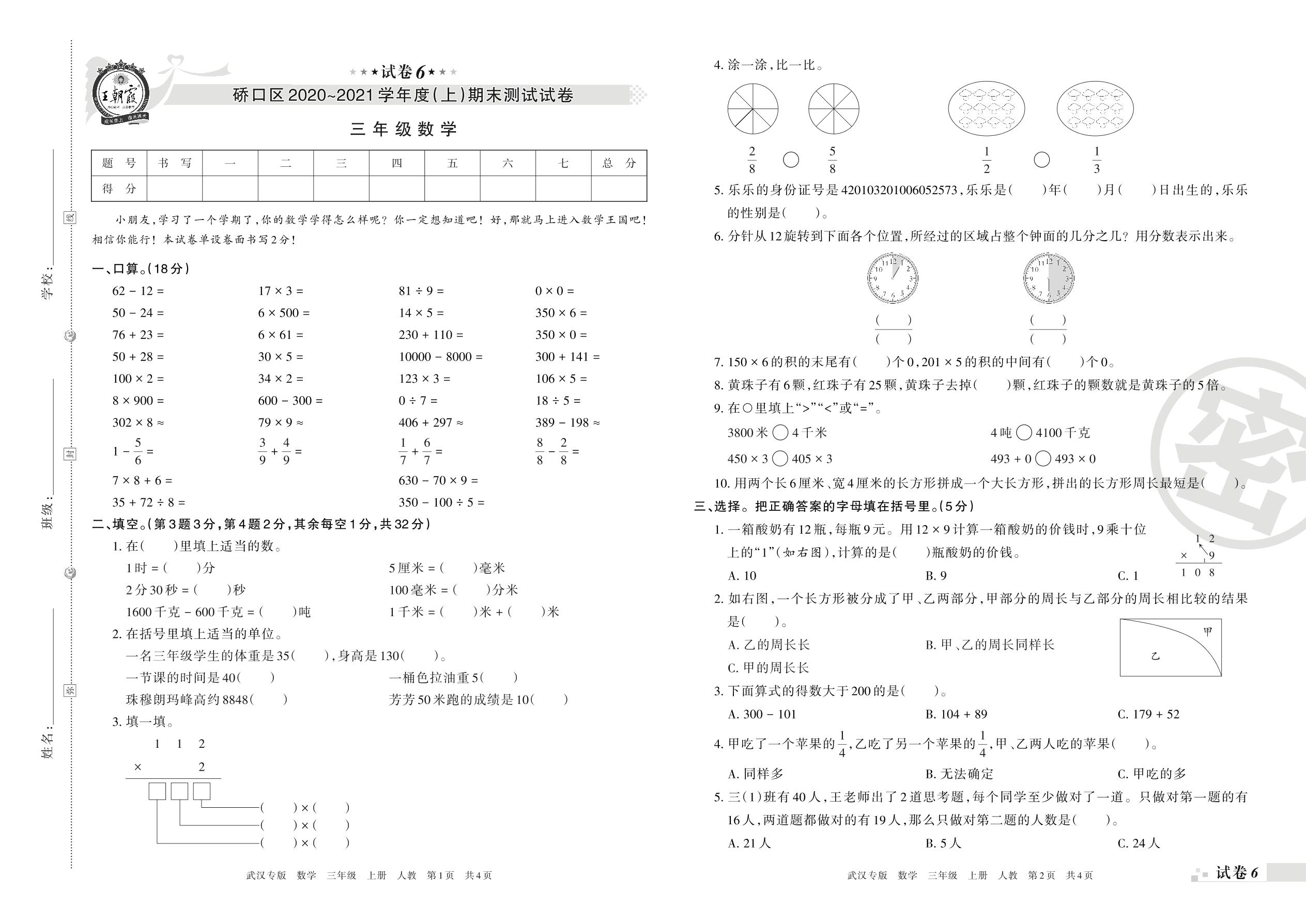 硚口区2020~2021学年度(上)期末测试试卷三年级数学(人教版)【6】