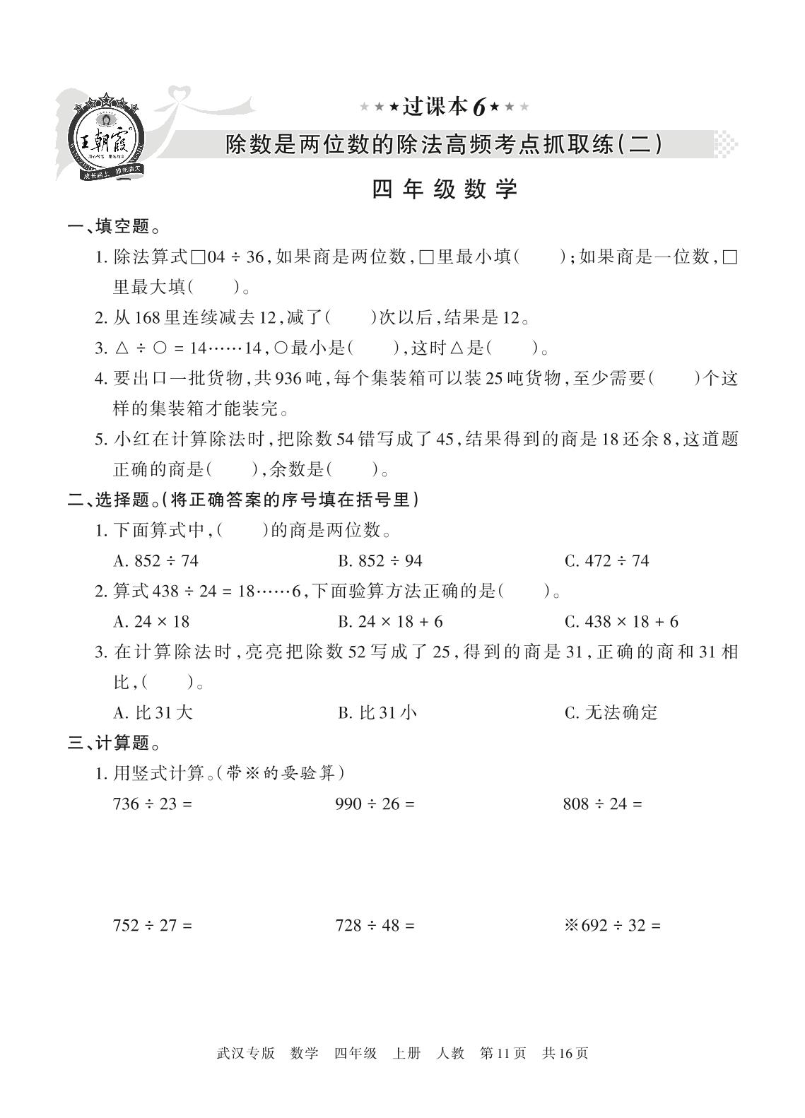 王朝霞期末过课本——除数是两位数的除法高频考点抓取练(二)四年级上册数学(人教版)_R211224092018045【6】