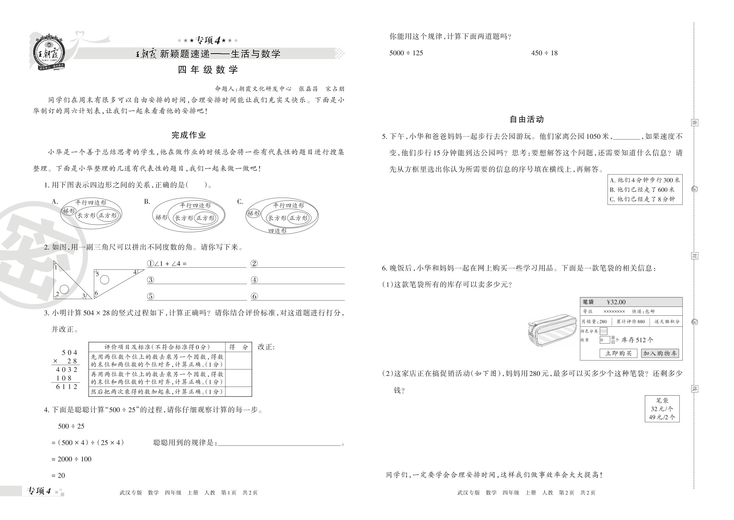 王朝霞期末专项卷——新颖题速递:生活与数学四年级上册数学(人教版)_R211224092018298【4】