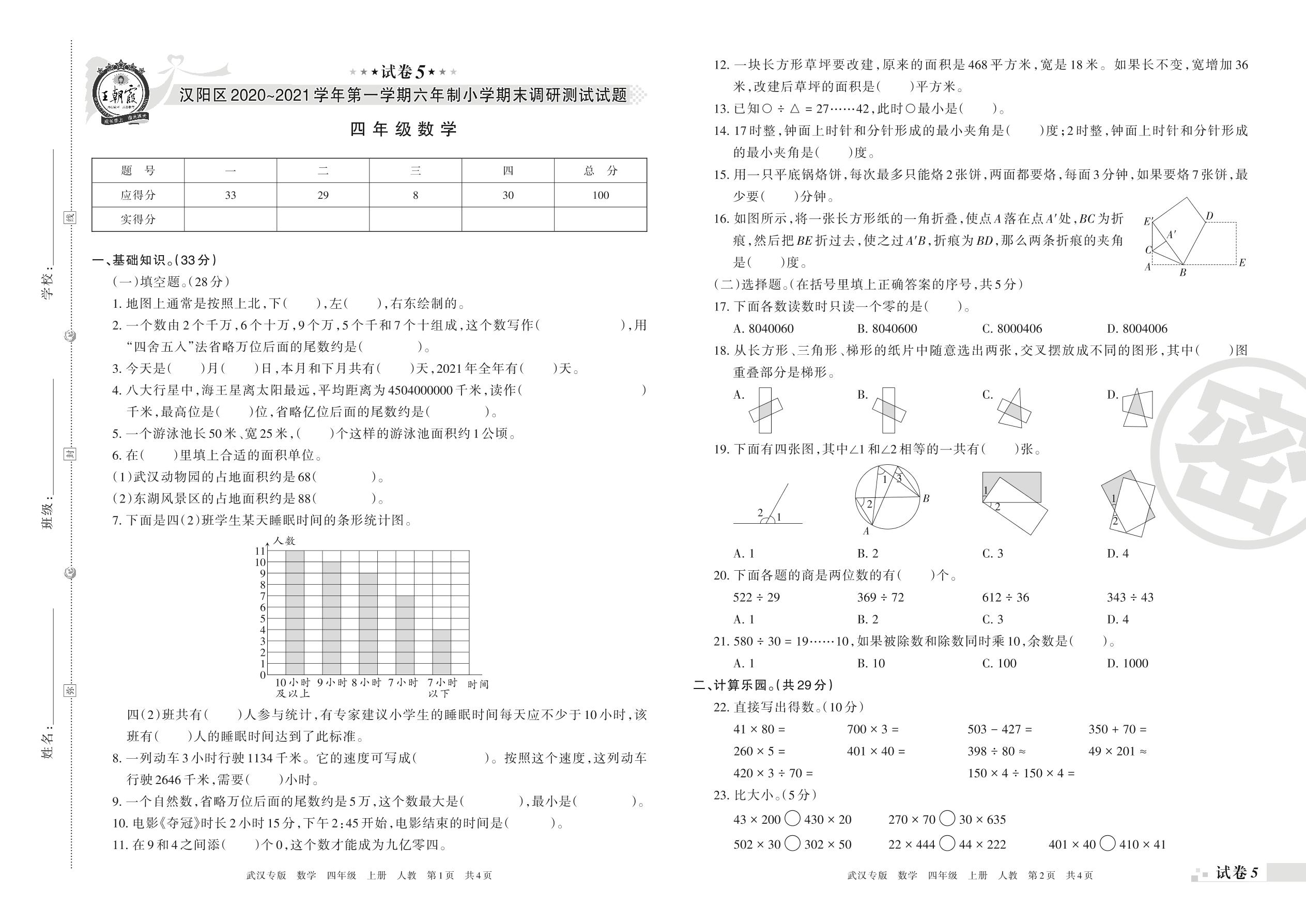 汉阳区2020~2021学年第一学期六年制小学期末调研测试试题四年级数学(人教版)【5】