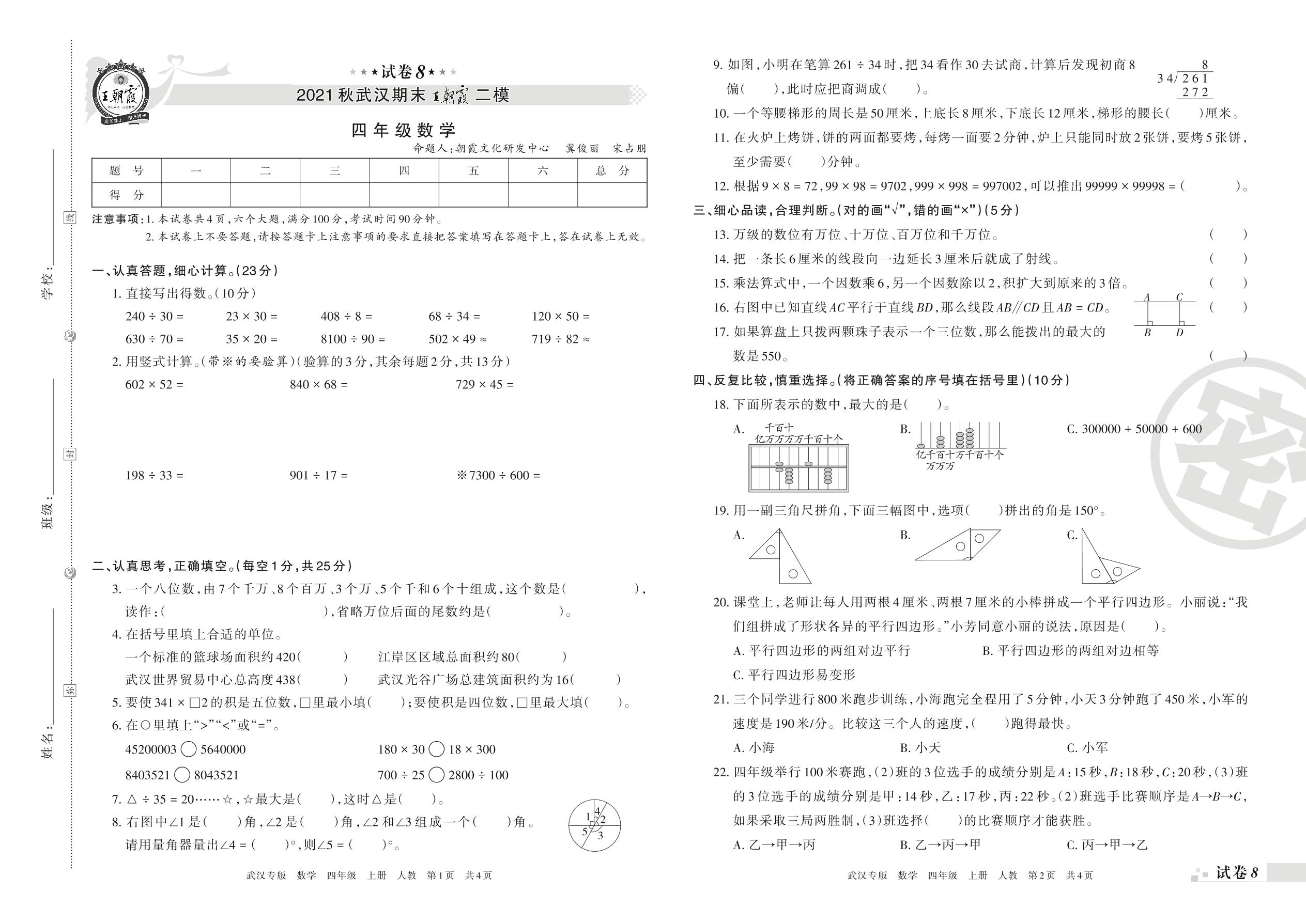 王朝霞期末模拟卷四年级上册数学(人教版)_R211224092018773【8】