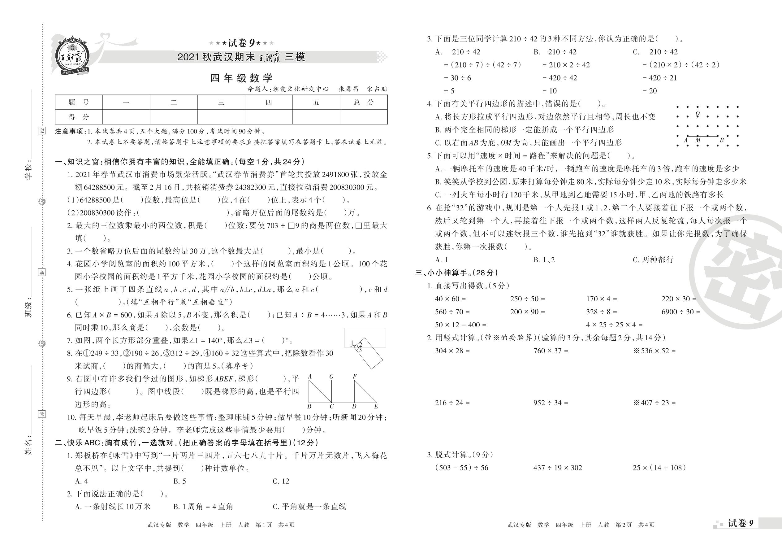 王朝霞期末模拟卷四年级上册数学(人教版)_R211224092018612【9】