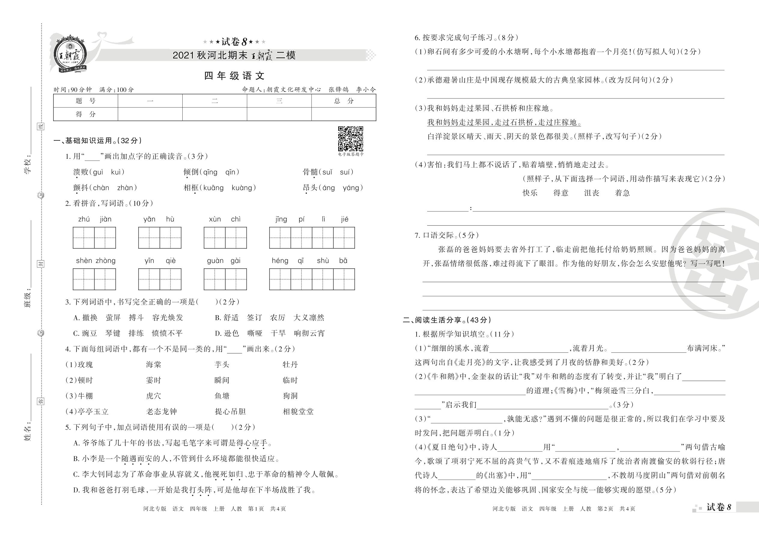 王朝霞期末模拟卷四年级上册语文(人教版)_R211224092046072【8】