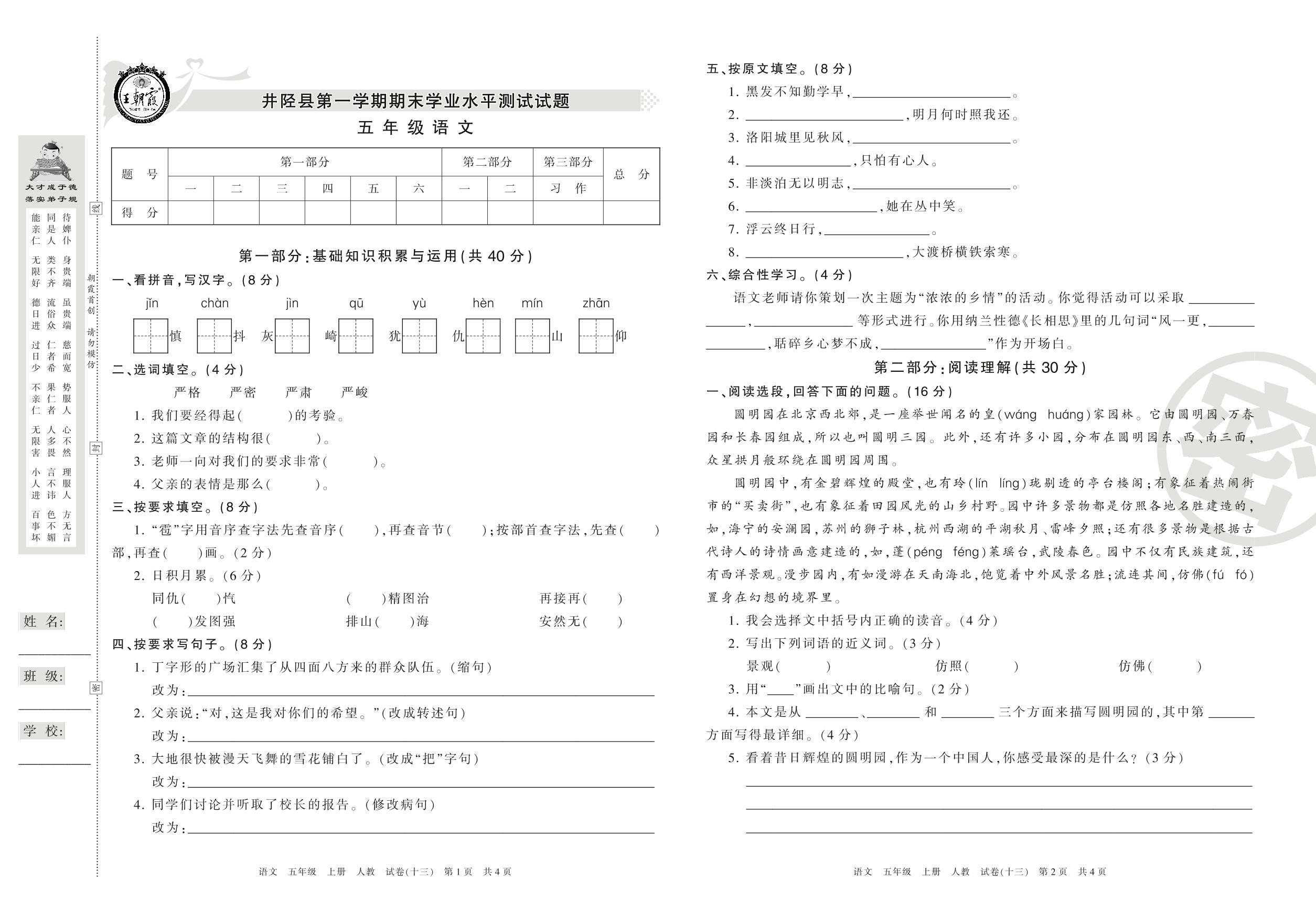 2016-2017学年第一学期石家庄市井陉县五年级语文试卷(人教版)【13】