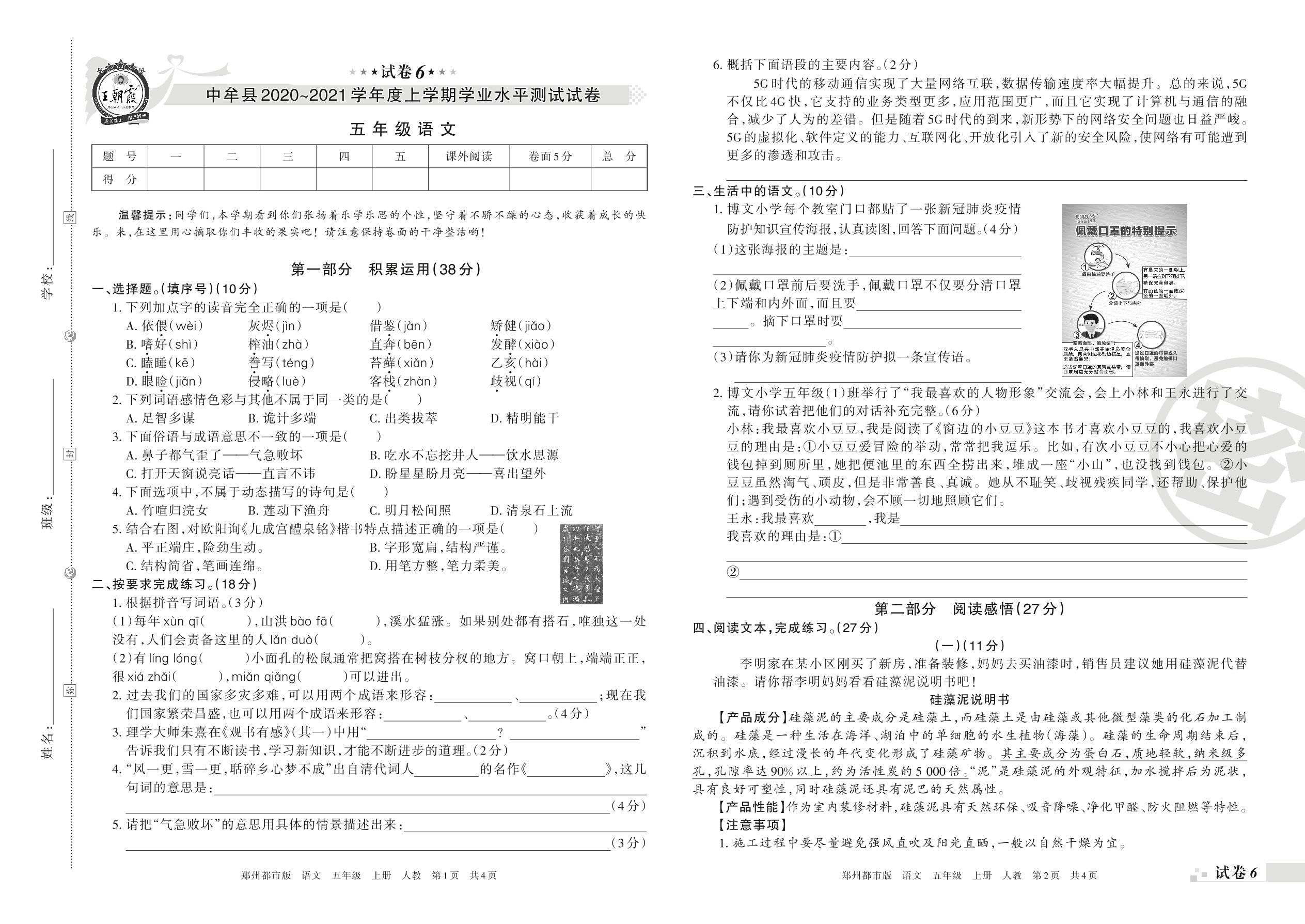 中牟县2020~2021学年度上学期学业水平测试试卷五年级语文(人教版)【6】